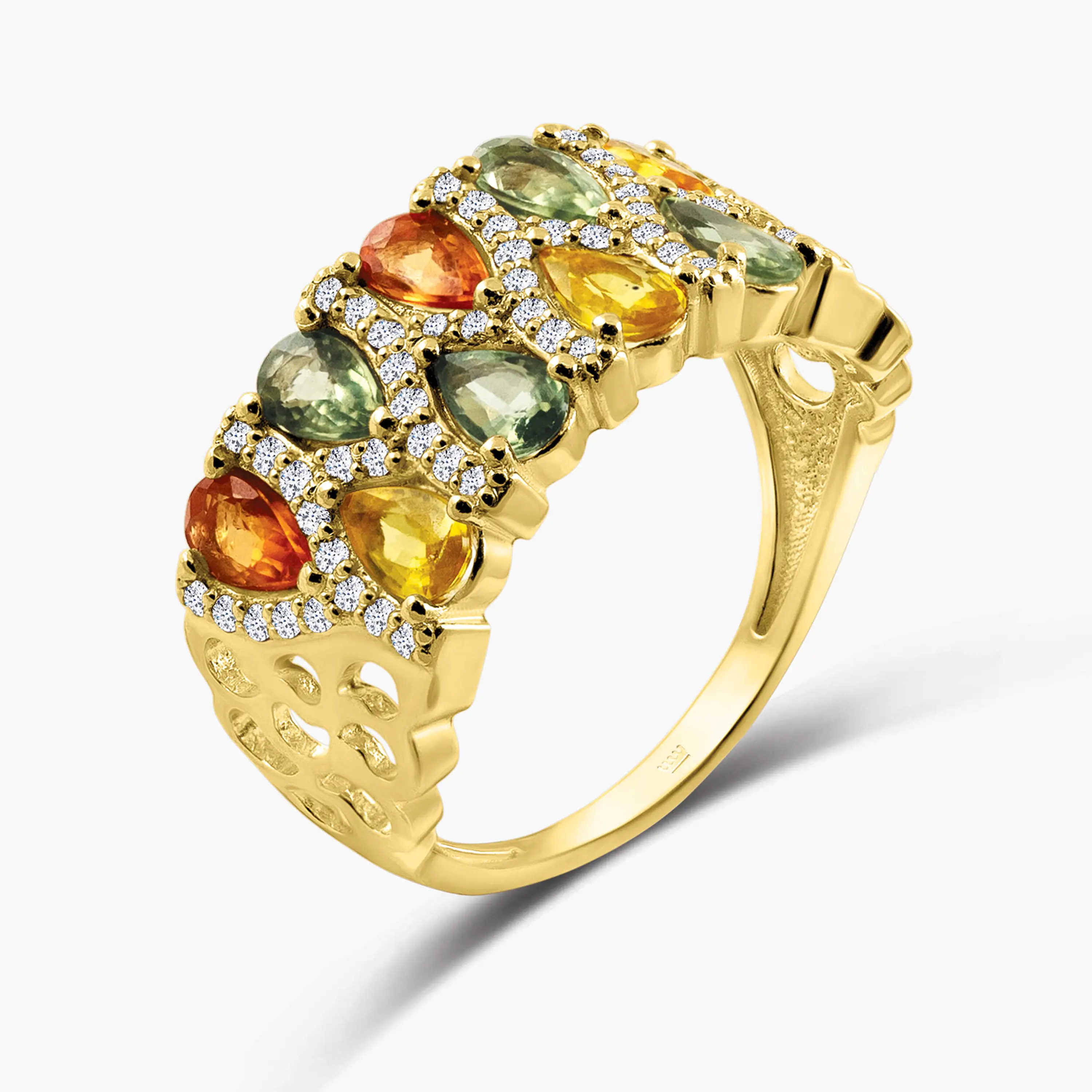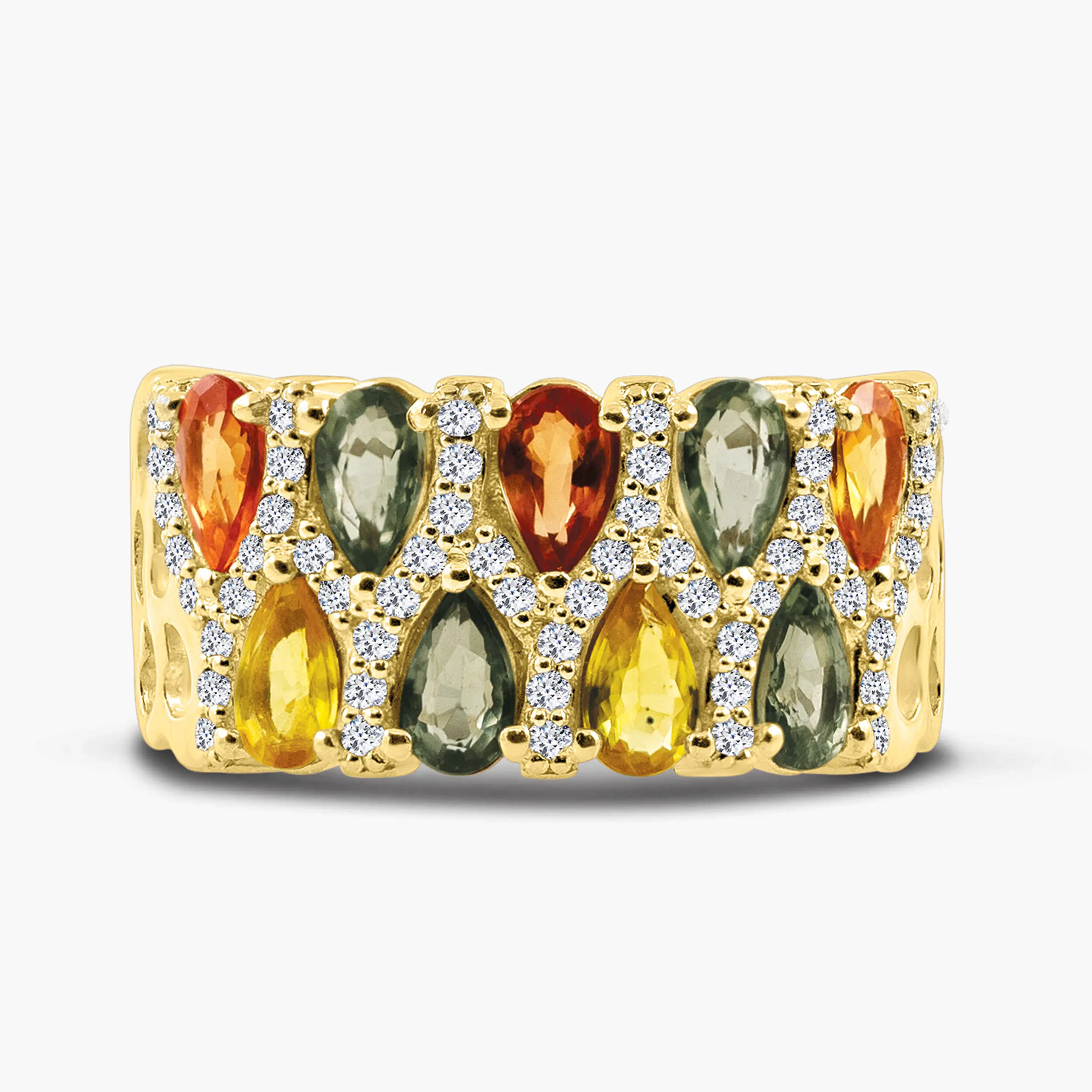 טבעת רחבה בזהב צהוב 14K, משובצת בתשעה אבני ספיר טבעיות בגווני כתום, צהוב וירוק, המסודרות בצורת טיפה. כל אבן מוקפת במסגרת של 53 יהלומים טבעיים ונוצצים, היוצרים אפקט מנצנץ ועשיר. העיצוב הרב-שכבתי והצבעוניות החמה יוצרים מראה בולט, חגיגי וייחודי מושלם למי שאוהבת תכשיטים מלאי נוכחות.