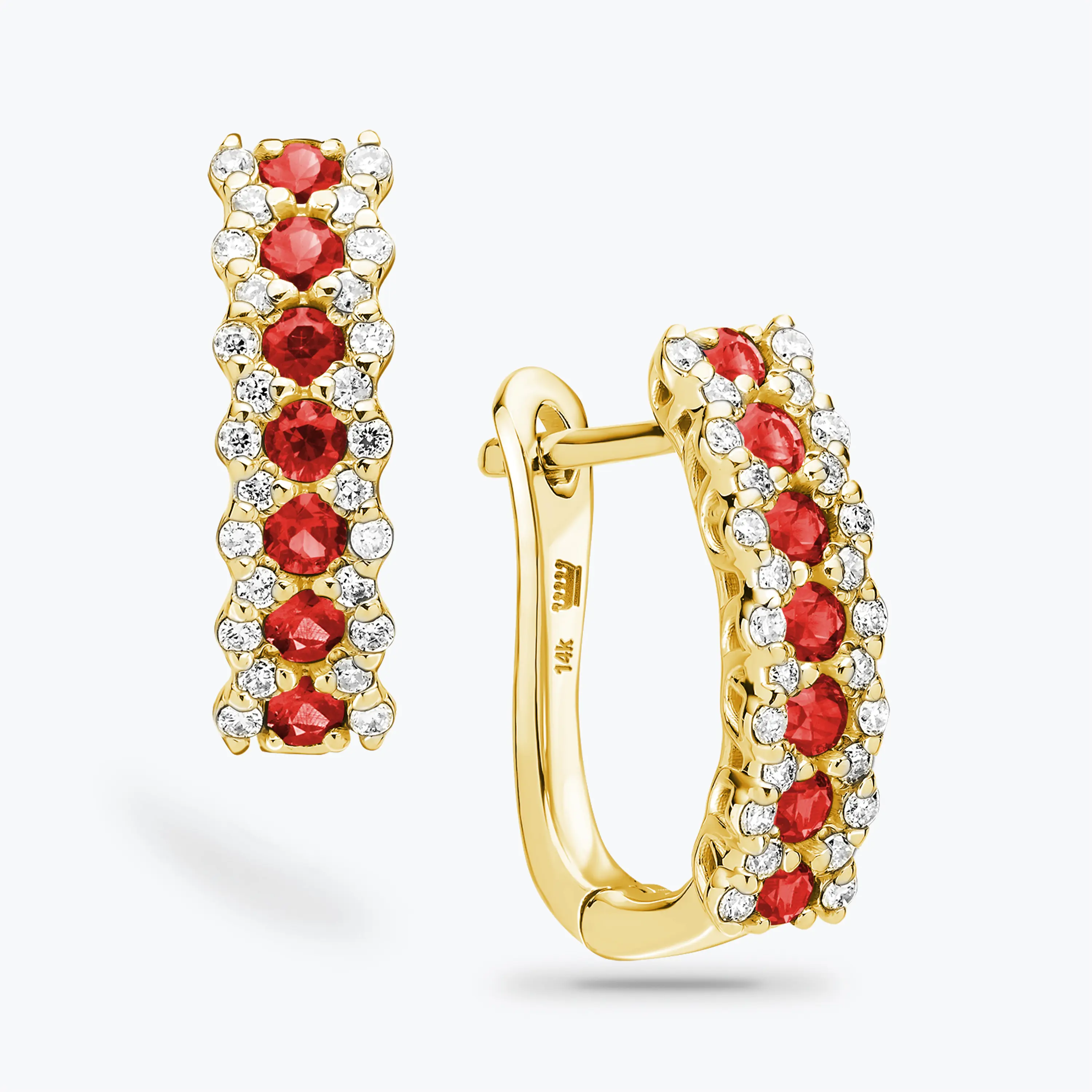 עגילי אדל הקלאסיים מזהב 14K בעיצוב חישוק חצי פתוח, המשלבים אלגנטיות נצחית עם צבע עז ונוכחות יוקרתית.כל עגיל משובץ ב-7 אבני רובי טבעיות בגוון אדום עמוק, עטופות במסגרת של יהלומים טבעיים ונוצצים. סך הכל משובצים בשני העגילים 52 יהלומים טבעיים ונוצצים.