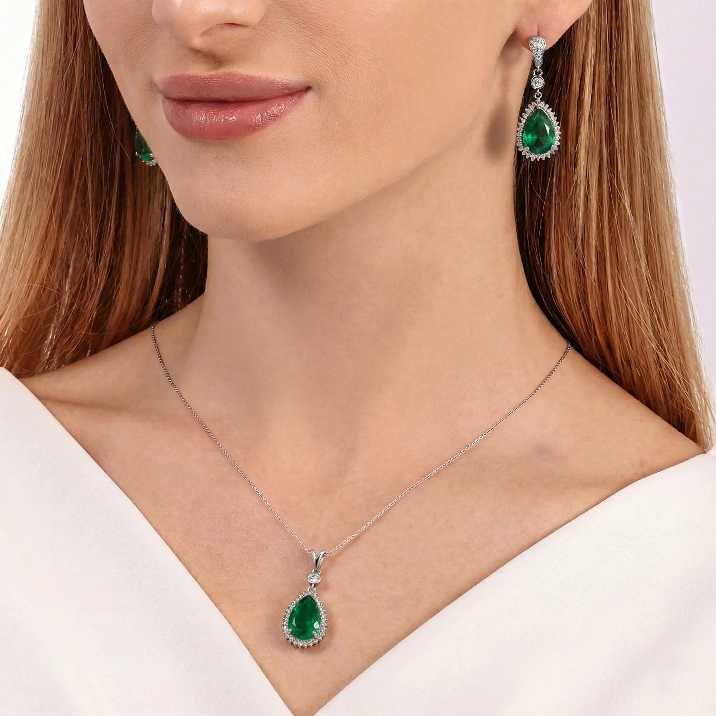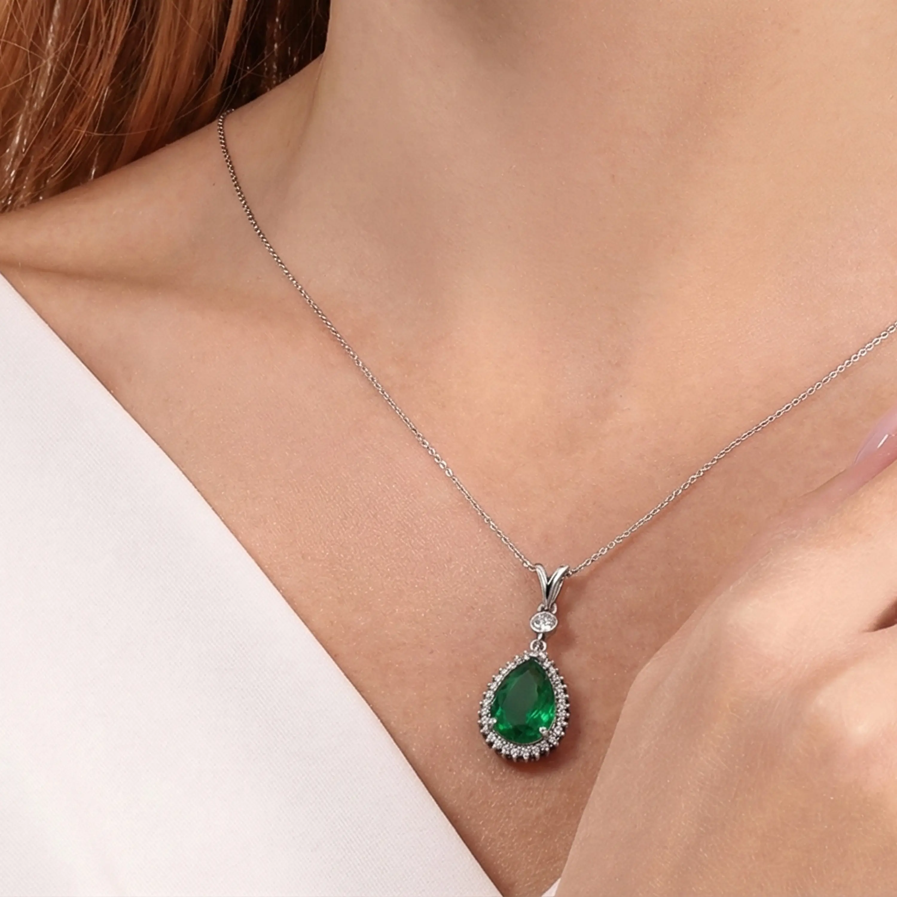תליון אמרלד מעבדה ויהלומי מעבדה בזהב 14K בעיצוב טיפה קלאסי