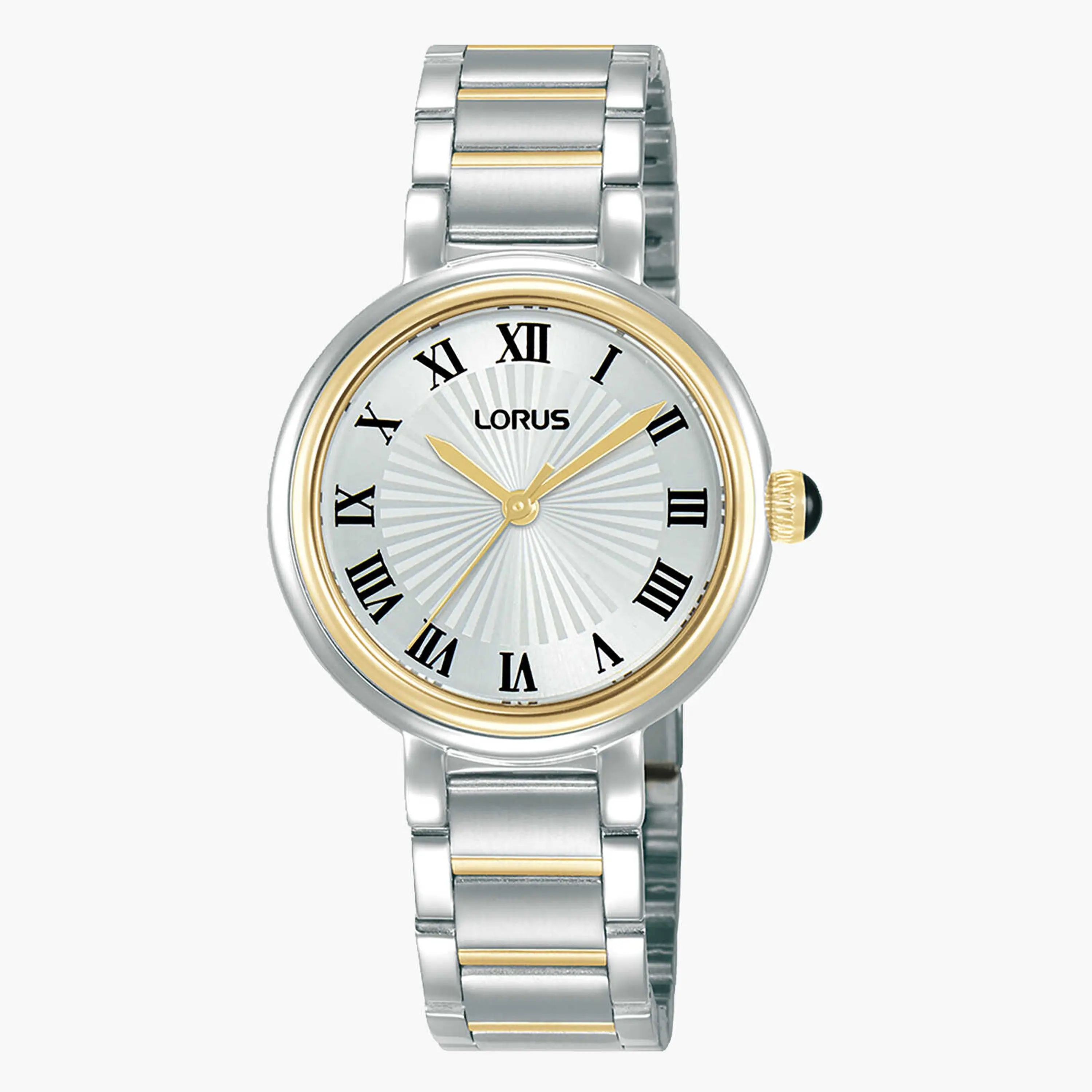 שעון Lorus נשים בעיצוב קלאסי ועדין עם גוף עשוי פלדת אל-חלד בגוון זהוב- כסוף ובקוטר 30 מ"מ , vיוצר נוכחות יומיומית אלגנטית המתאימה לכל פרק כף יד. לוח השעון בגוון לבן בטקסטורת קרני שמש עם מחוגי שעות דקות ושניות- לקריאה ברורה ופשוט. השעון פועל באמצעות מנגנון קוורץ מדויק מסוג PC21 שמעניק פעולה אמינה יומיומית. השעון כולל זכוכית קריסטל מינרלית שטוחה המגינה על הלוח ומעניקה עמידות בפני שריטות ורצועת פלדת אל-חלד מעוצבת המשתלבת בצורה חלקה עם גוף השעון. השעון עמיד במים עד 50 מ' ומאפשר שימוש יום-יומי. לשעון סוגר צמיד תלת-קיפול עם לחצני שחרור המבטיח התאמה יציבה ונוחה לפרק היד. דגם זה משלב עיצוב קלאסי עם פונקציונליות פשוטה ומדויקת- פתרון קלאסי ואיכותי לנשים המחפשות שעון אמין עם נוכחות נקייה ומעודנת.