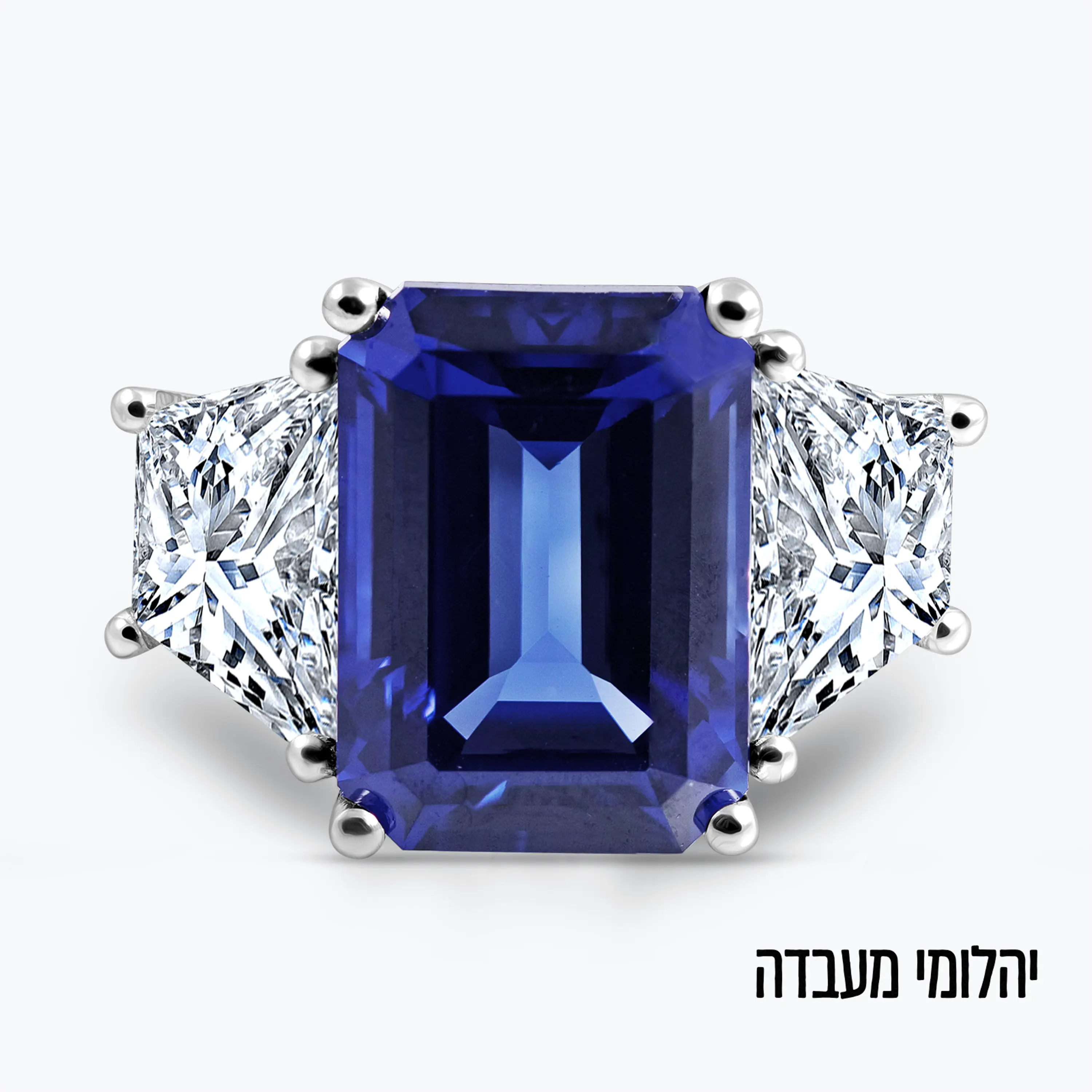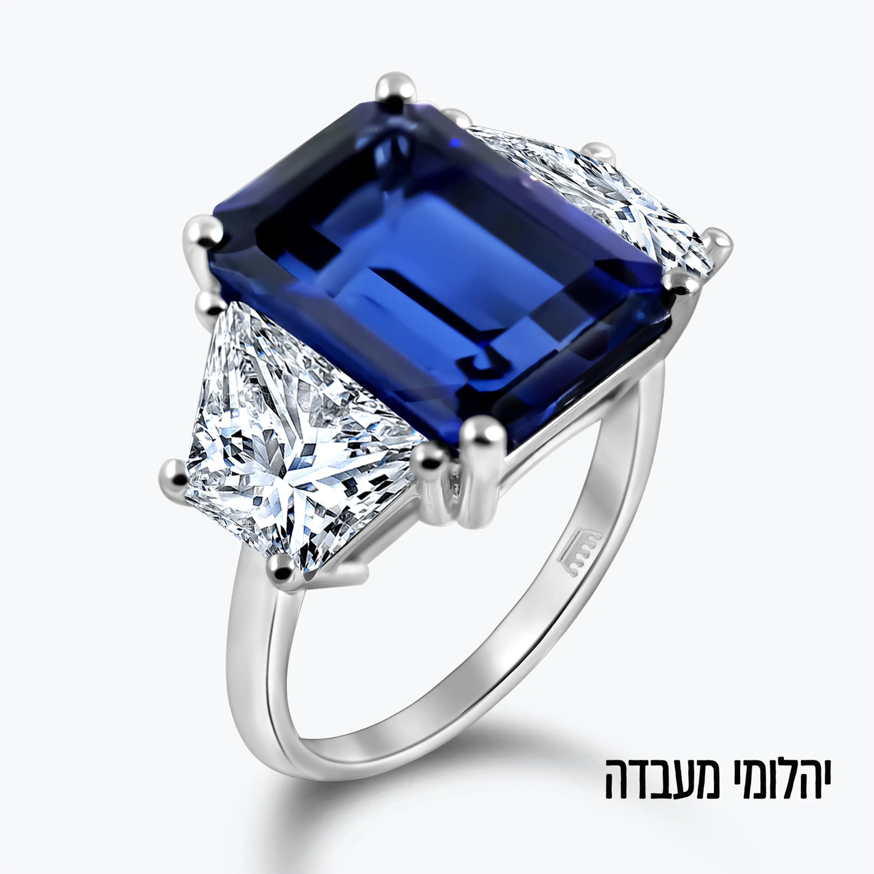טבעת מרשימה עשויה זהב לבן 14K, עם אבן ספיר כחולה מרכזית בחיתוך מלבני שמעניקה עומק וצבע עשיר. משני צדי האבן המרכזית משובצים יהלומי מעבדה בעיצוב נקי ומעודן שמעצימים את הברק והנוכחות של התכשיט.