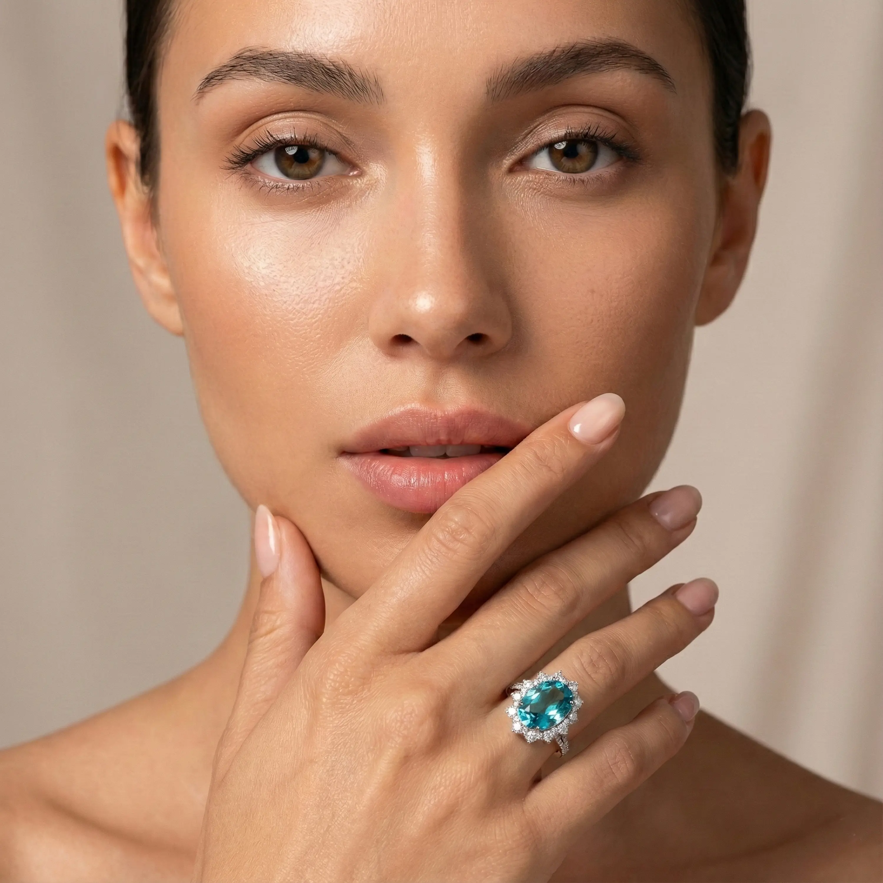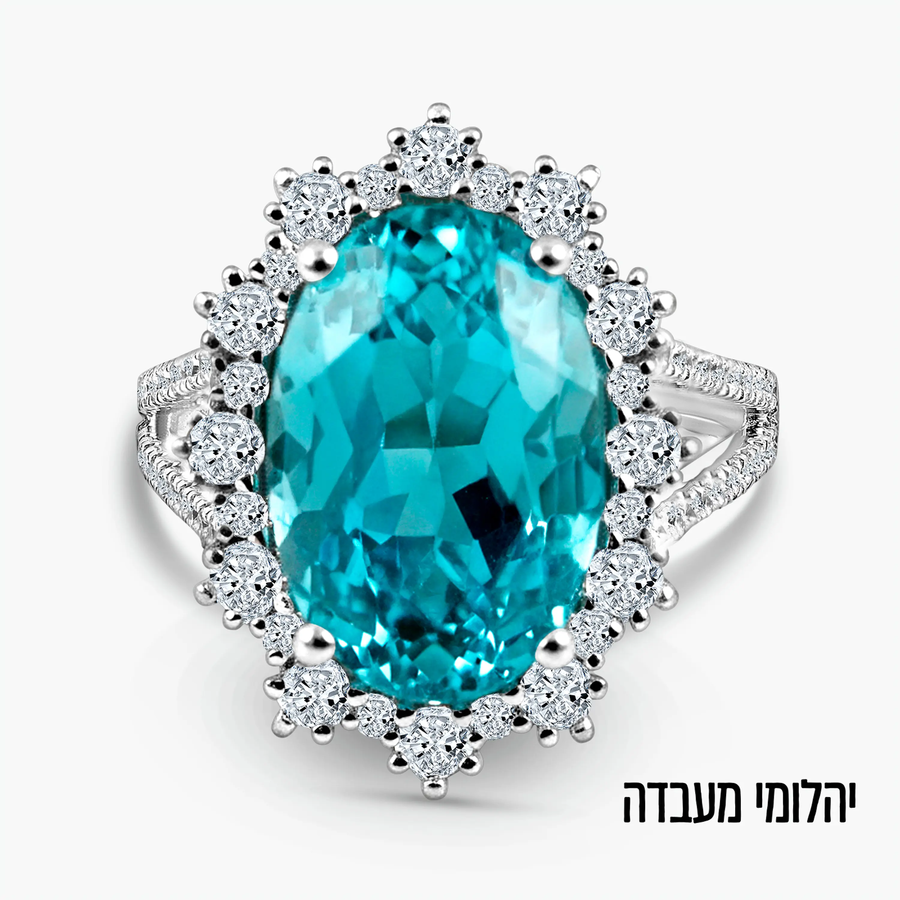 טבעת אלגנטית במיוחד המשובצת ביהלום מעבדה כחול (13.2 קראט) בעל נוכחות עוצמתית, בחיתוך פאריי (Lab Parai). סביבו מסודרים בקפידה עשרות יהלומי צד עגולים (CVD, דרגת ניקיון VVS, צבע D), התורמים לניצוץ יוצא דופן. גוף הטבעת עשוי זהב 14K לבן, ועיצוב הפיצול הכפול של הזרועות מדגיש את יופייה של האבנים ומעניק לטבעת מראה יוקרתי במיוחד.
