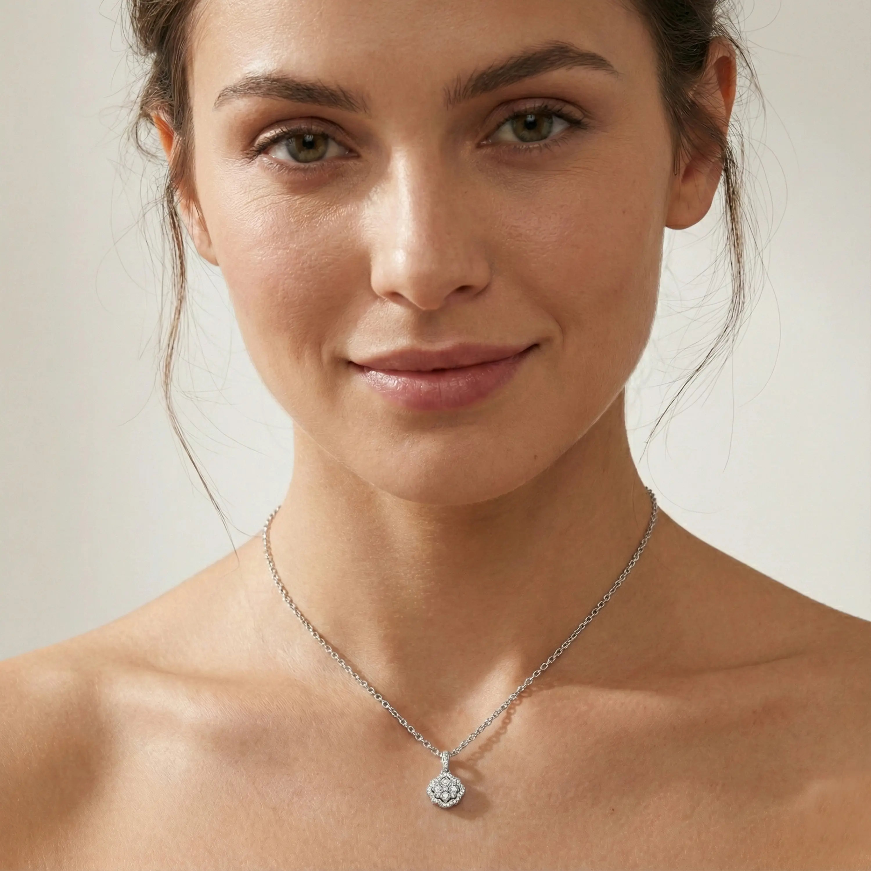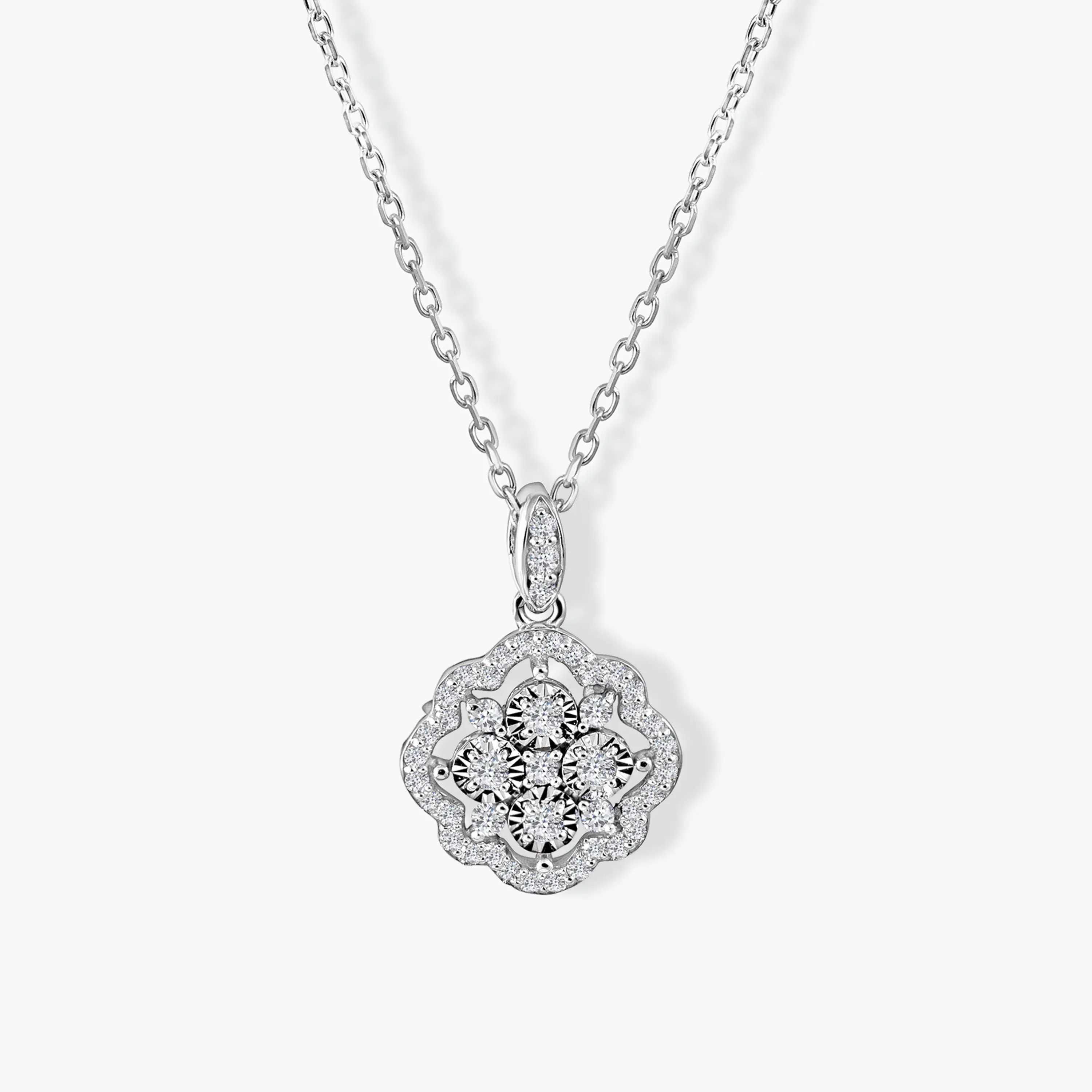 תליון אלגנטי מזהב לבן 14K בעיצוב פרח רך ועל זמני. השיבוץ של יהלומים טבעיים יוצר מראה מלא אור וברק, עם תחושת עומק ועידון מכל זווית. עיצוב קלאסי שמתאים לשימוש יומיומי וגם לאירועים מיוחדים, ומשתלב בקלות עם כל סגנון לבוש