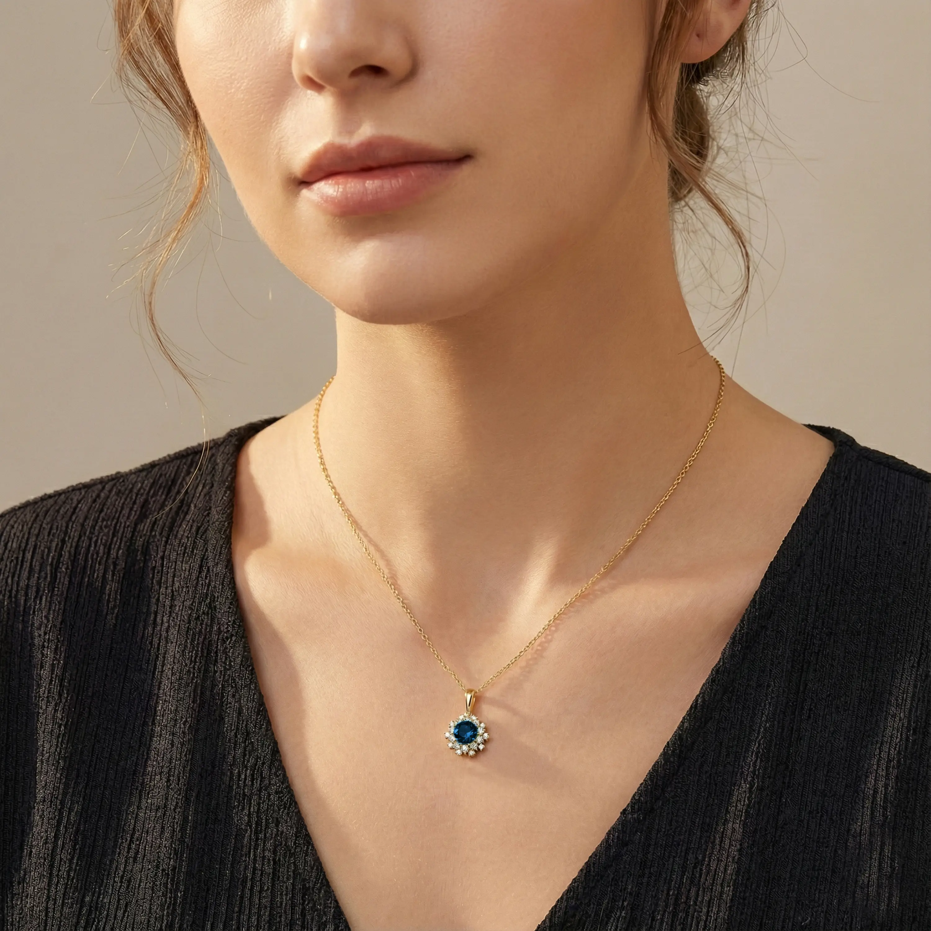 תליון עשוי זהב 14K בעיצוב הילה עגול ועל זמני. במרכז משובץ ספיר בגוון כחול עמוק, מוקף שיבוץ יהלומים היוצר מסגרת זוהרת ומאוזנת סביב האבן המרכזית. הלולאה מעוצבת בקו נקי ומשתלבת בהרמוניה עם מבנה התליון. תכשיט אלגנטי עם נוכחות קלאסית, מתאים לשילוב יומיומי וגם כהשלמה מושלמת למראה ערב.