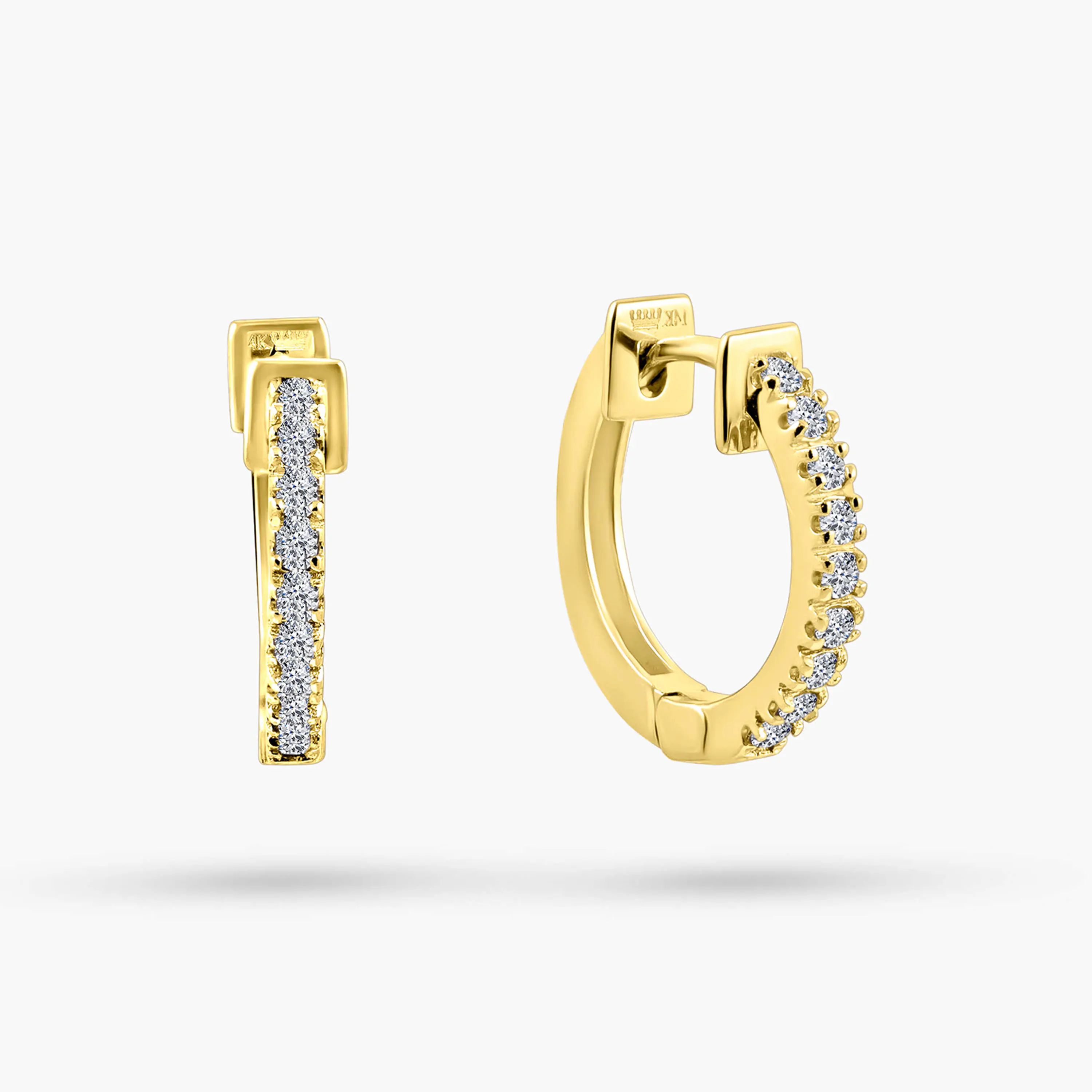 עגילי חישוק אלגנטיים בעיצוב נקי ומדויק, עשויים זהב 14K בגימור לבן מבריק. החישוק מעוטר בשורת יהלומים משובצים בקפידה, ליצירת מראה זוהר ועדין שמתאים ליום ולערב. המבנה הקומפקטי והסגירה הנוחה מעניקים תחושת ביטחון ונוחות בשימוש יומיומי, לצד נוכחות יוקרתית ומעודנת. תכשיט על זמני שמשתלב בקלות עם כל סגנון.