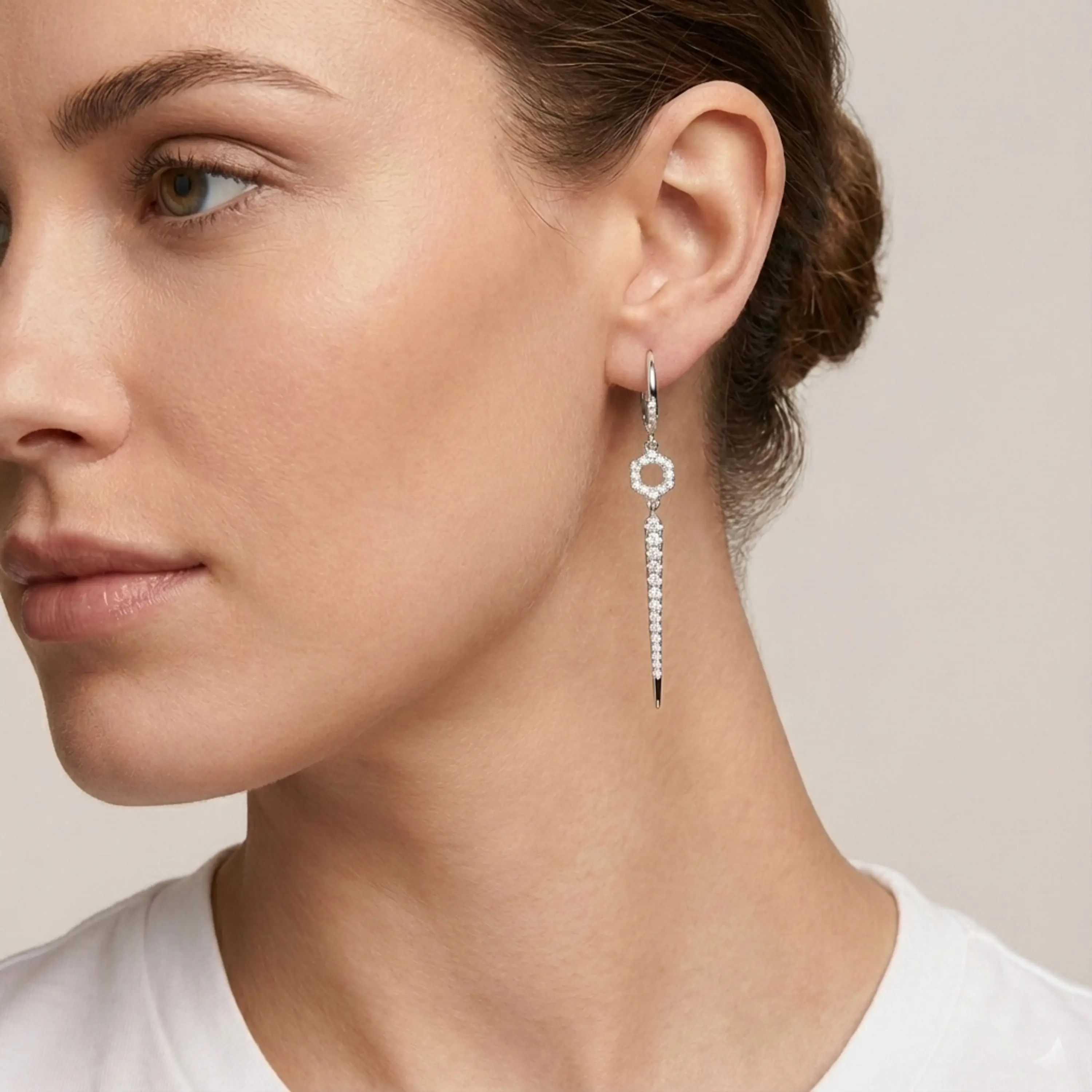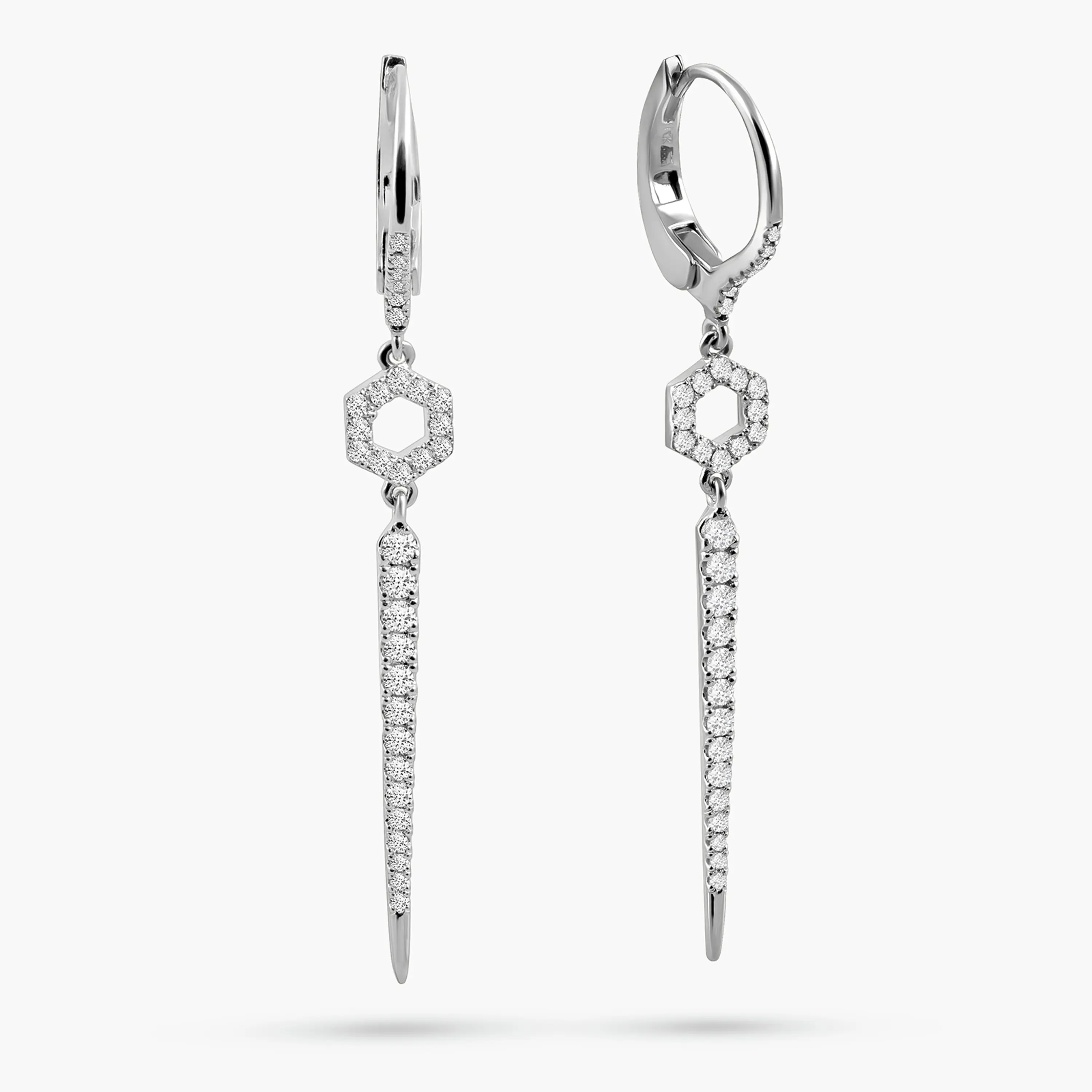 עגילים תלויים בעיצוב מודרני ומדויק, עשויים זהב לבן 14K בגימור לבן מבריק. החלק העליון כולל חישוק אלגנטי ממנו משתלשל אלמנט גאומטרי משובץ יהלומים, המוביל לתליון מאורך ועדין המשובץ יהלומים לכל אורכו. השילוב בין צורה גאומטרית לקו ארוך ודק יוצר מראה מתוחכם עם נוכחות ברורה אך מאוזנת. תכשיט שמוסיף אופי ואלגנטיות, מתאים לערב וגם ללוק יומיומי מוקפד.