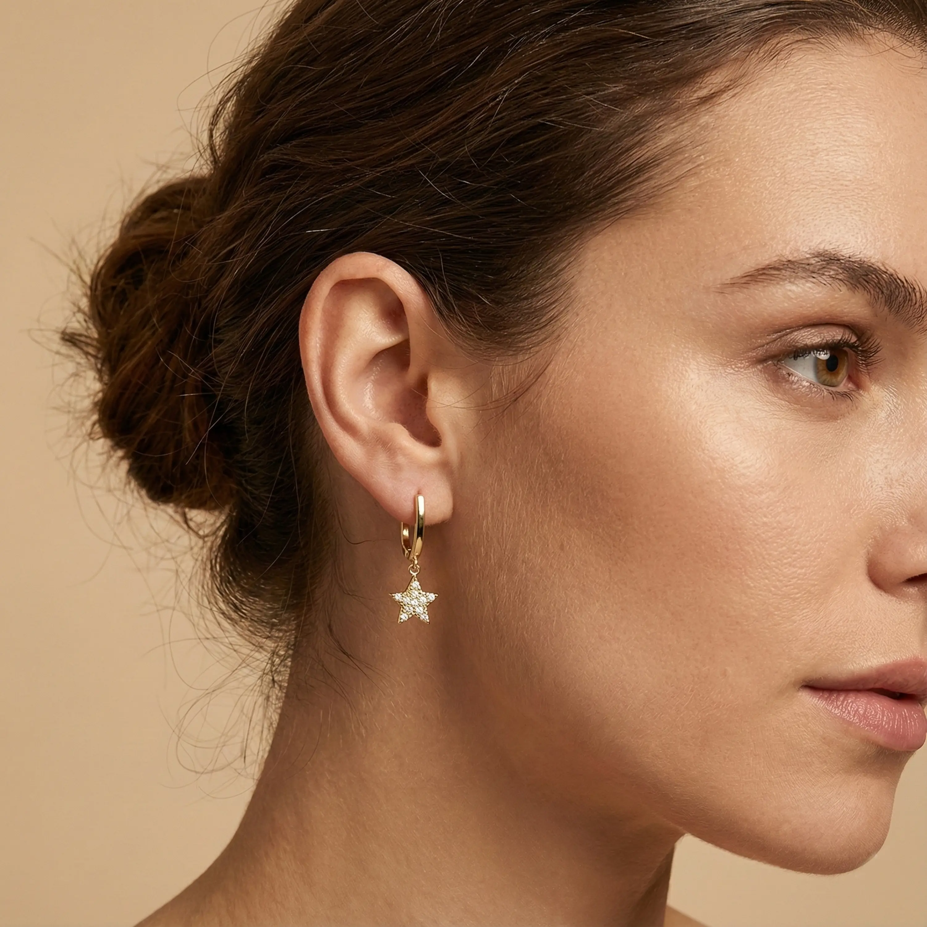 עגילי חישוק אלגנטיים עשויים זהב 14K בגימור צהוב מבריק, עם תליון כוכב עדין המשובץ יהלומים. העיצוב משלב חישוק נקי וקלאסי עם אלמנט תלוי מלא אור, היוצר מראה נשי ומאוזן בין יוקרה לקריצה קלילה. התנועה העדינה של התליון מוסיפה נוכחות וזוהר, ומתאימה לשימוש יומיומי לצד הופעה חגיגית. תכשיט על זמני עם אופי, שמשתלב בקלות עם סגנונות שונים.