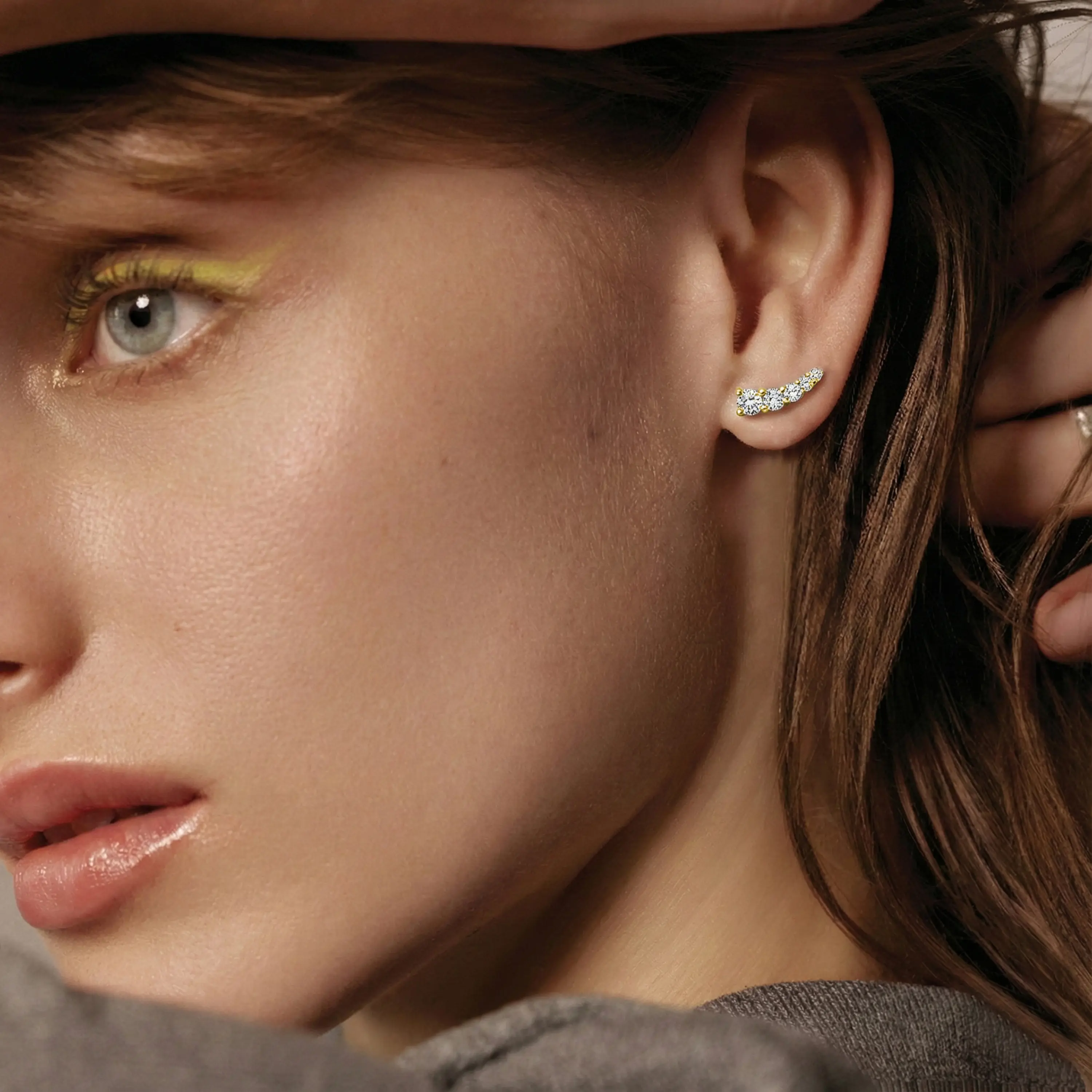 עגילים צמודים בעיצוב נקי ומדויק, עשויים זהב 14K בגימור לבן מבריק. חזית העגיל משובצת יהלומים מדורגים בקו מעוגל ועדין, היוצר מראה זורם עם ברק מאוזן ונוכחות אלגנטית. העיצוב הקומפקטי מחמיא לאוזן ומתאים לשימוש יומיומי, לצד מראה מוקפד שמתאים גם לערב. תכשיט על זמני למי שמחפשת יוקרה שקטה בלי מאמץ.