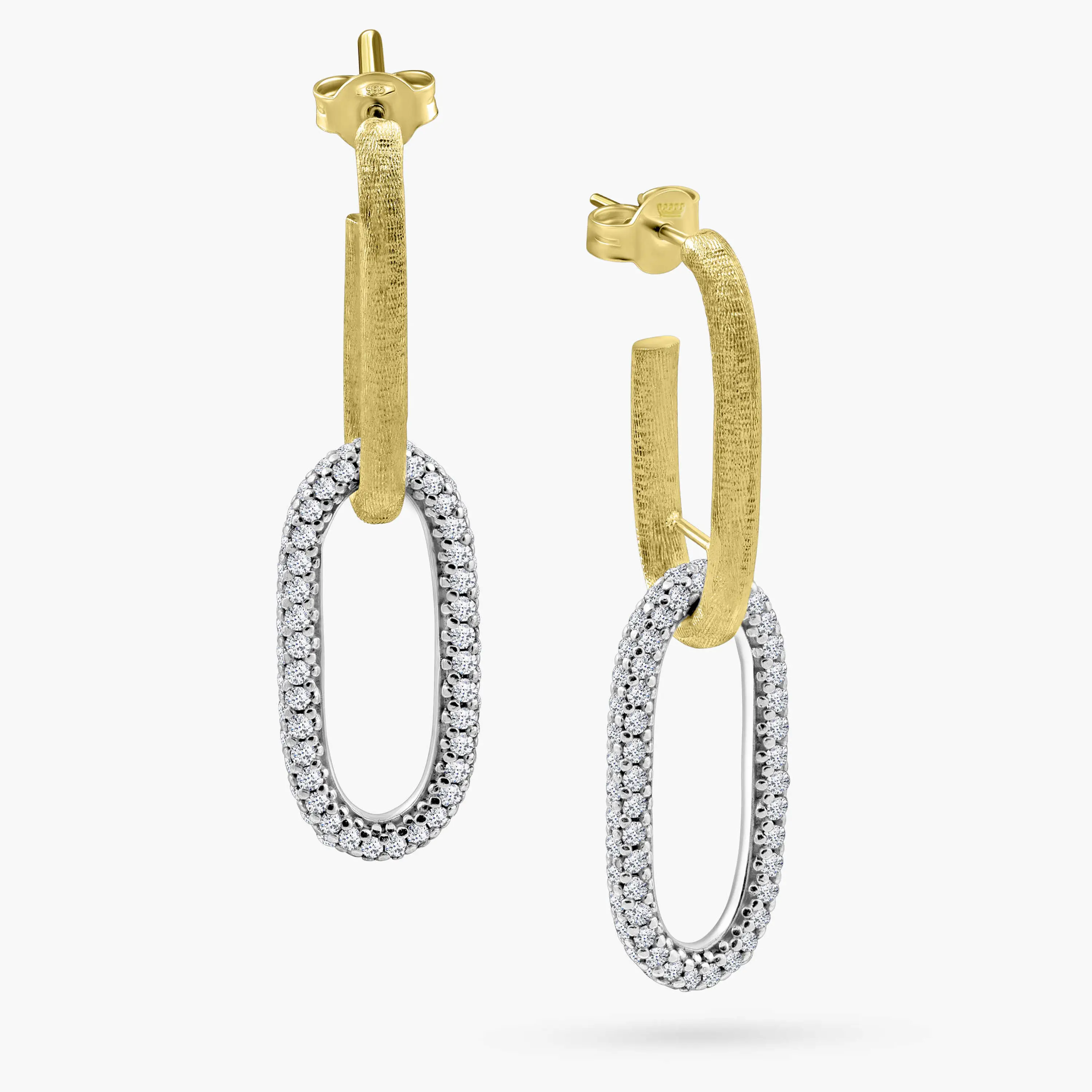 עגילי זהב 14K באורך 4.3 ס"מ בעיצוב אלגנטי של שתי חוליות מחוברות. חוליה עליונה בגימור מט נקי וחוליה תחתונה משובצת זרקונים לניצוץ עדין. שילוב מדויק בין מראה מודרני לנוכחות יוקרתית שמתאים גם לערב וגם ליום.