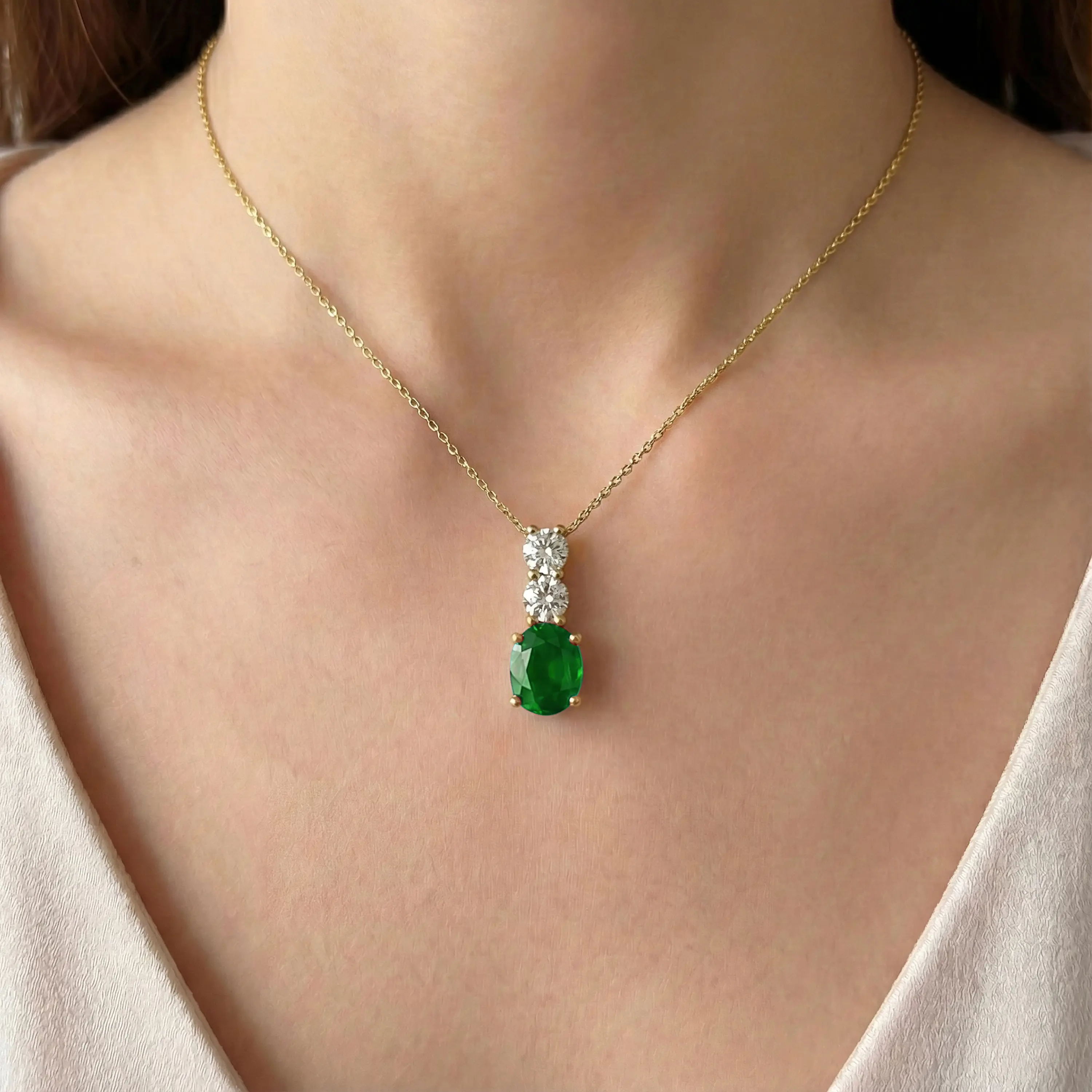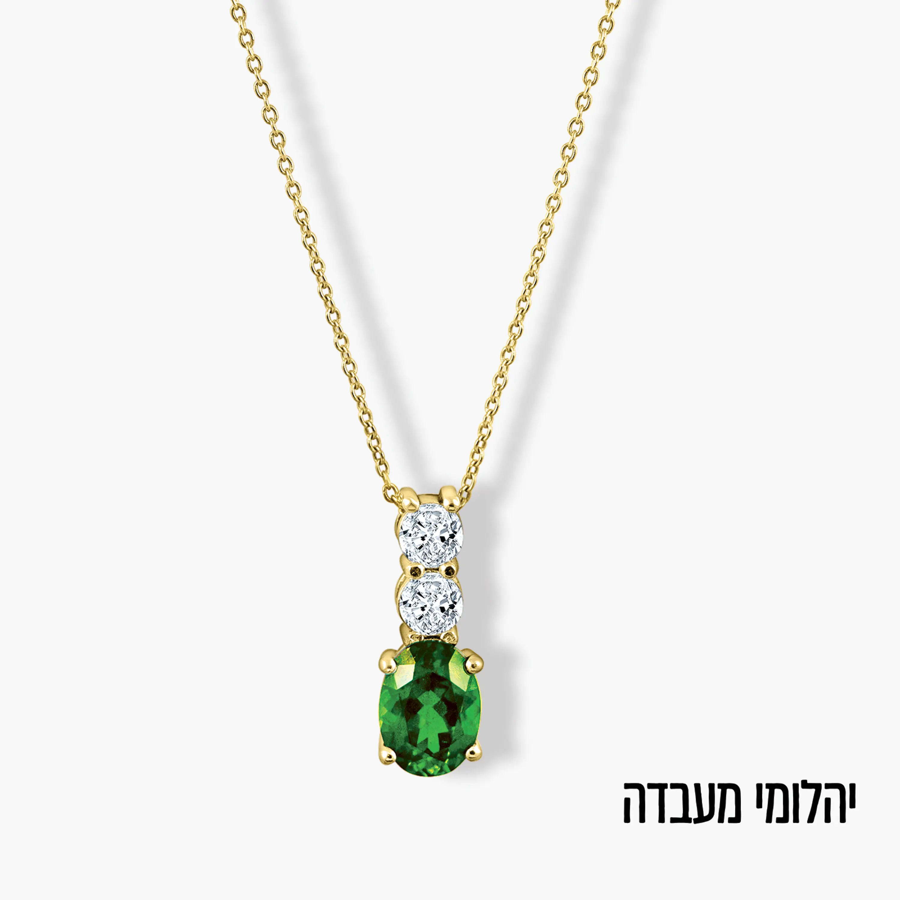 תליון זהב 14K בעיצוב אנכי אלגנטי, המשלב אמרלד מעבדה בגוון ירוק עמוק עם שני יהלומי מעבדה עגולים מעליו. השיבוץ המדויק והפרופורציות המאוזנות יוצרים מראה נקי ומואר, עם נוכחות עדינה שמרגישה יוקרתית ולא מתאמצת. האבן הירוקה מוסיפה עומק וצבע, והיהלומים מוסיפים נקודות אור שמדגישות את התליון בכל תנועה. תליון שמחמיא לבד למראה מינימליסטי, וגם משתלב נהדר בשכבות למראה עשיר יותר.