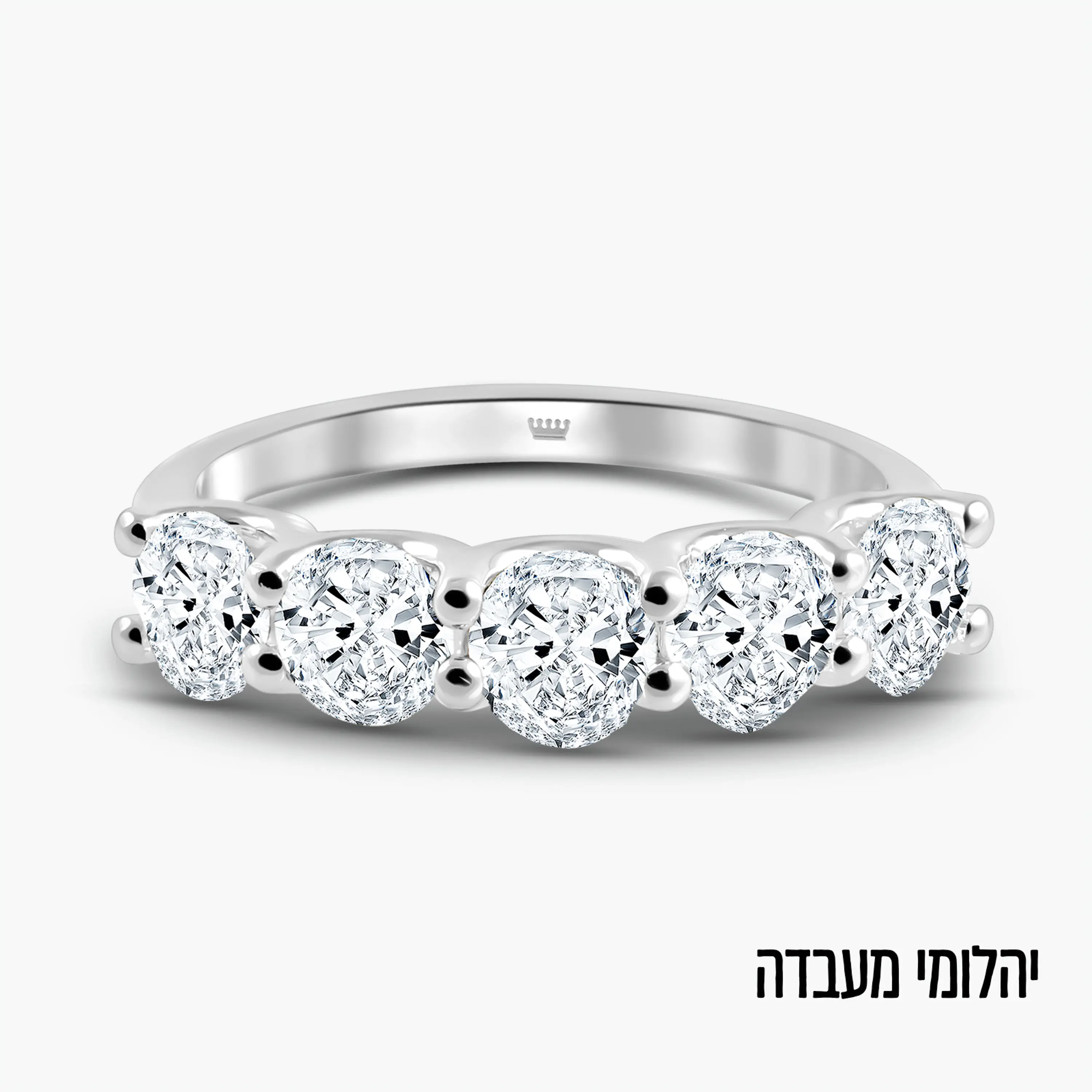 טבעת זהב 14K בגוון לבן בעיצוב חצי אינטרנטי נקי ומדויק, עם שורת יהלומי מעבדה עגולים במראה קלאסי שמחזיר אור מכל זווית. השיבוץ הגבוה והמאוורר מדגיש את הברק של היהלומים ושומר על קו אלגנטי ועדין על האצבע.