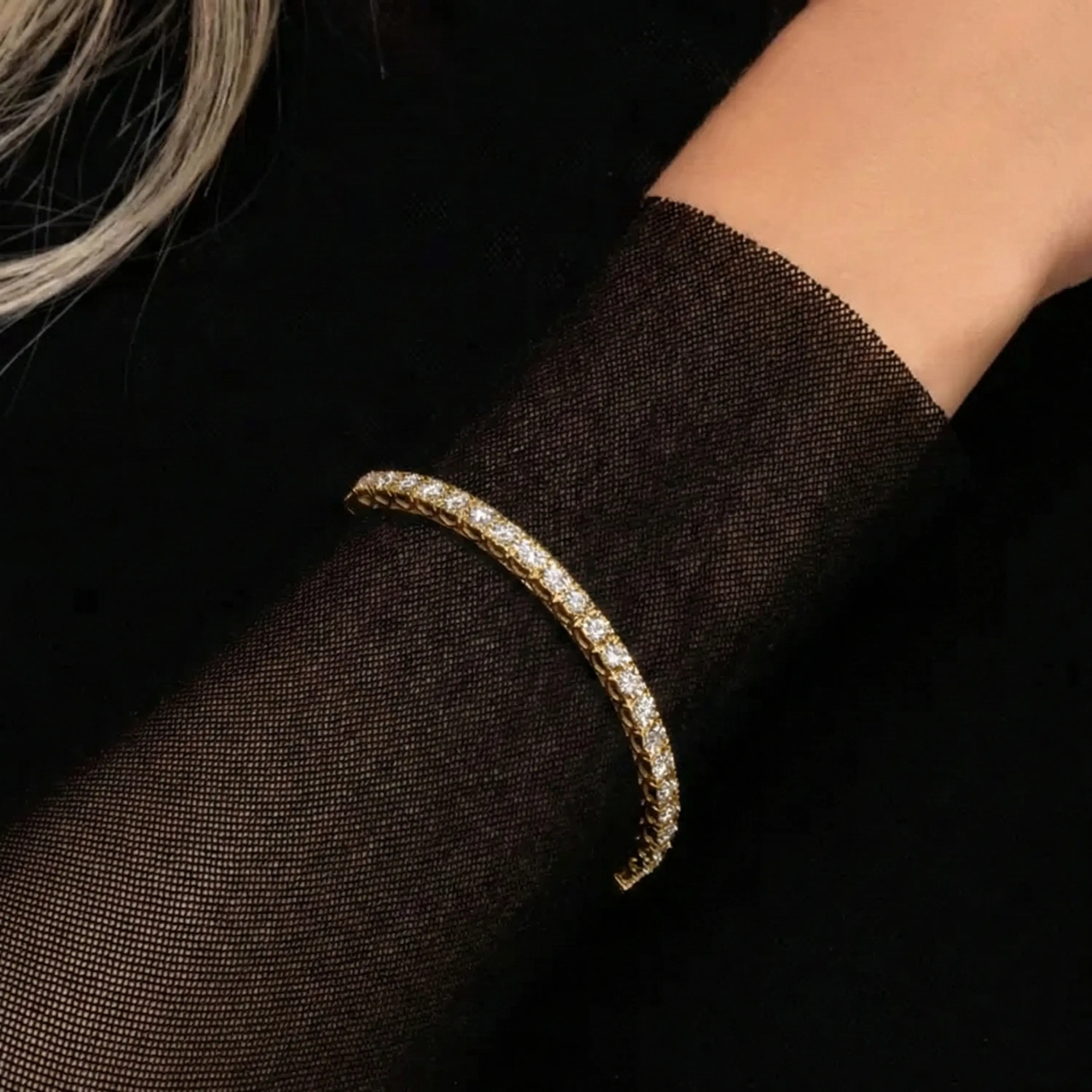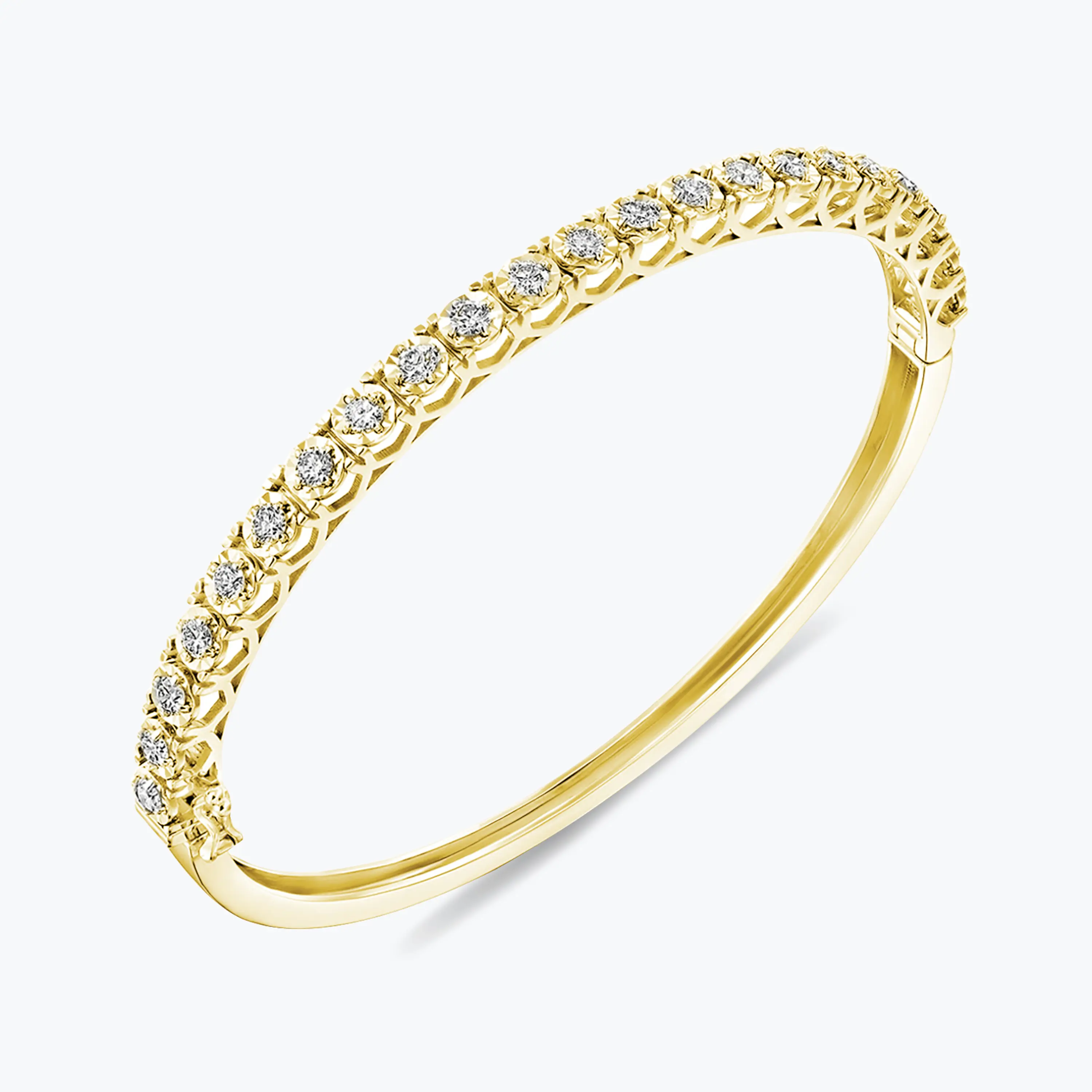 צמיד קשיח עשוי זהב 14K עם שיבוץ יהלומים אחיד לאורך החלק העליון, המעניק ברק יוקרתי ונוכחות נקייה ואלגנטית על פרק כף היד. מתאים לענידה יומיומית וגם לאירועים, ומשתלב בקלות עם תכשיטים נוספים.
