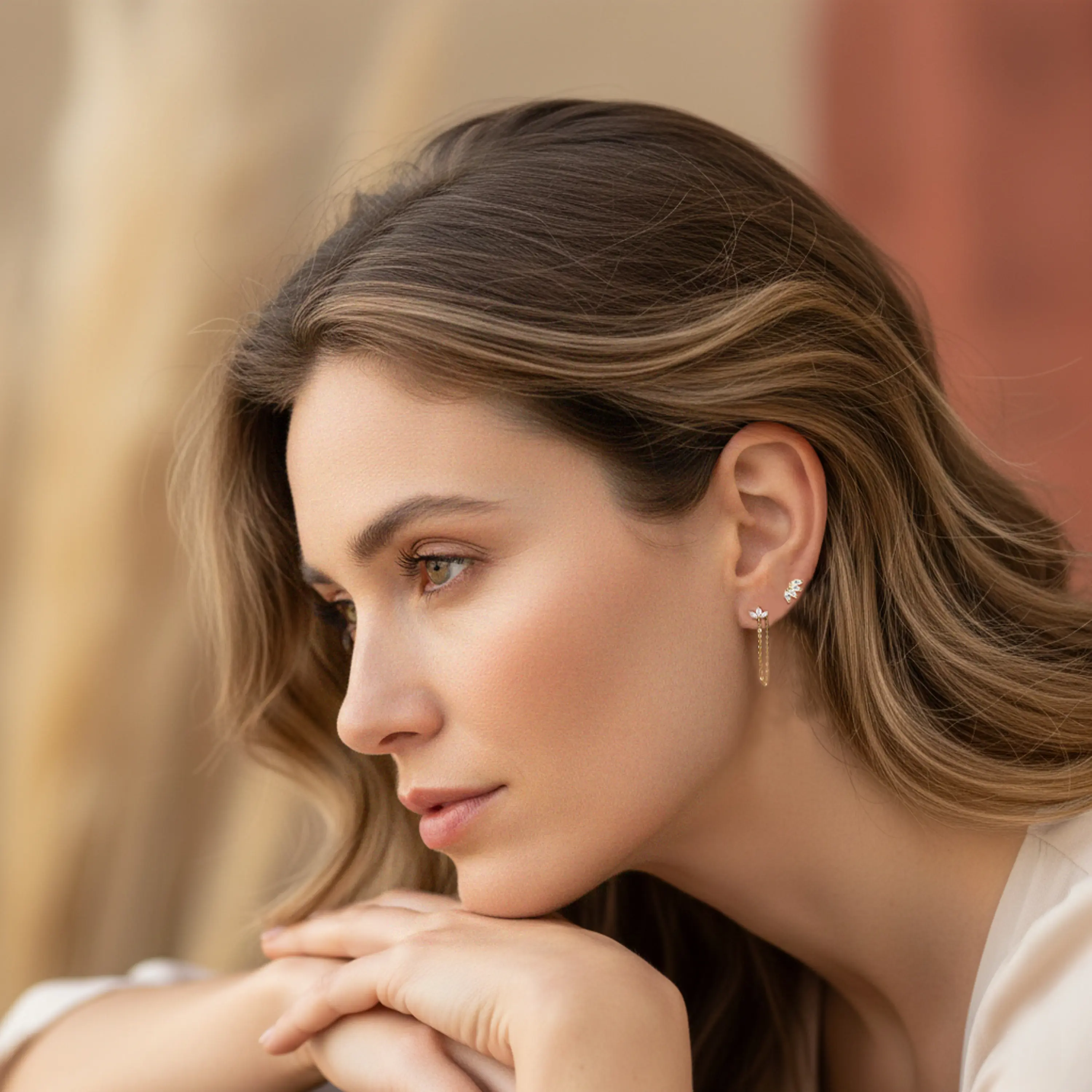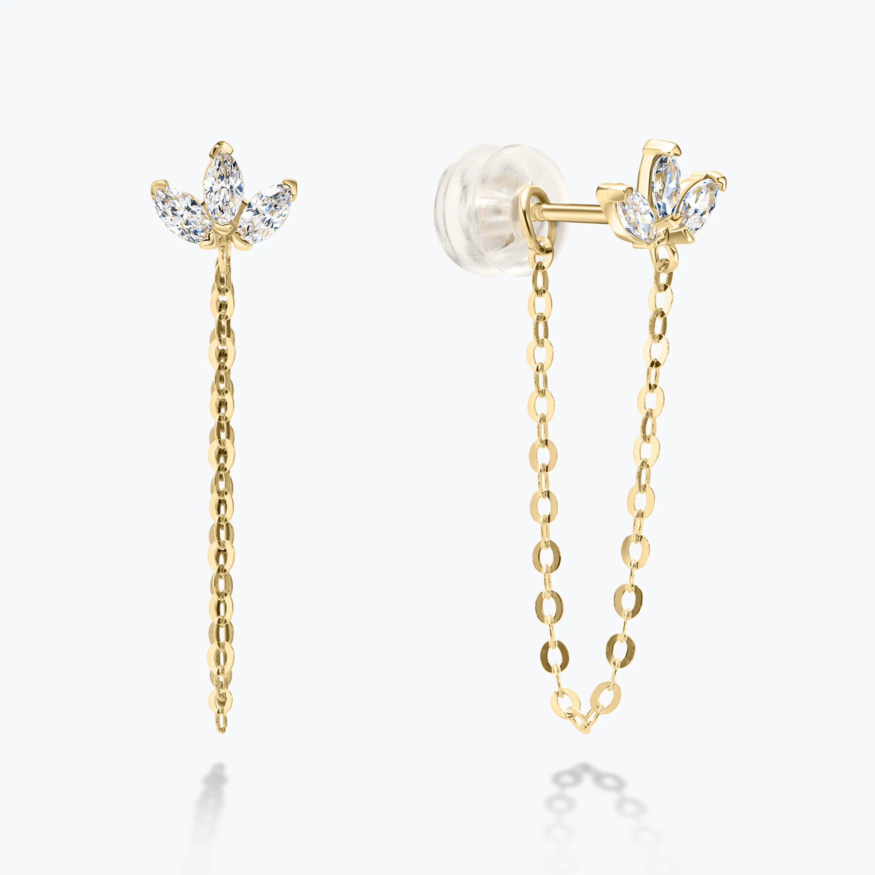 העגיל כולל שרשרת דקה באורך 35 מ"מ היוצרת תנועה רכה ומראה שכבות, ומתאים כעגיל פירסינג, עגיל שני או שלישי באוזן.