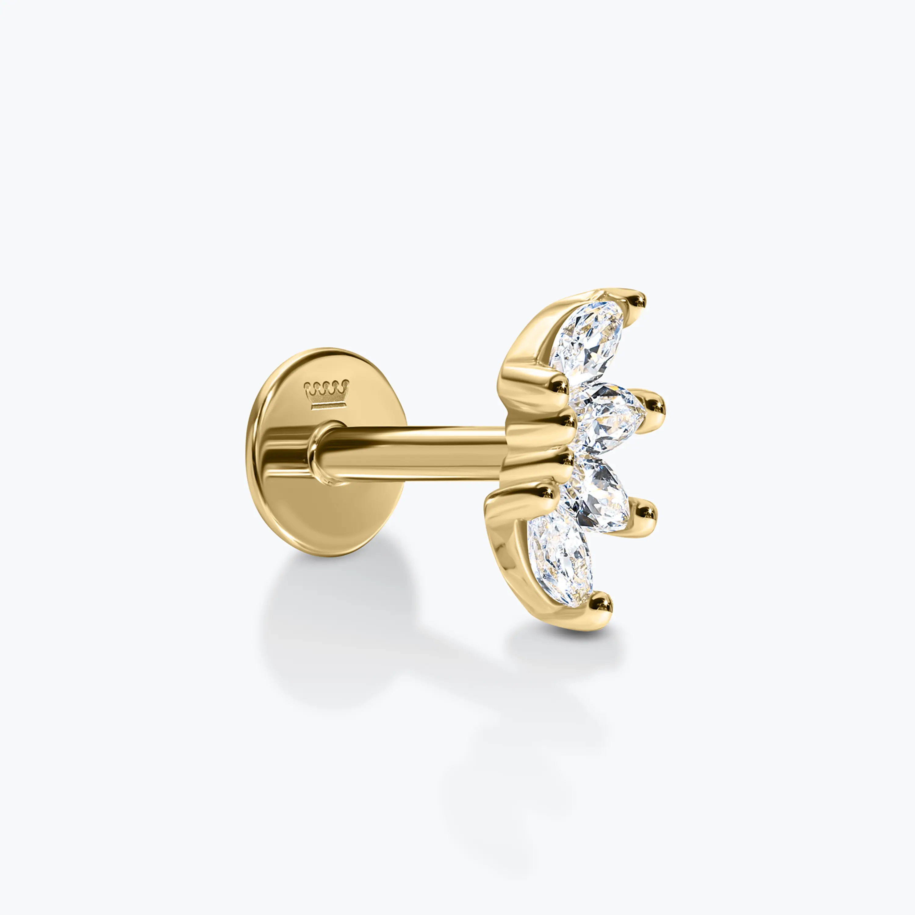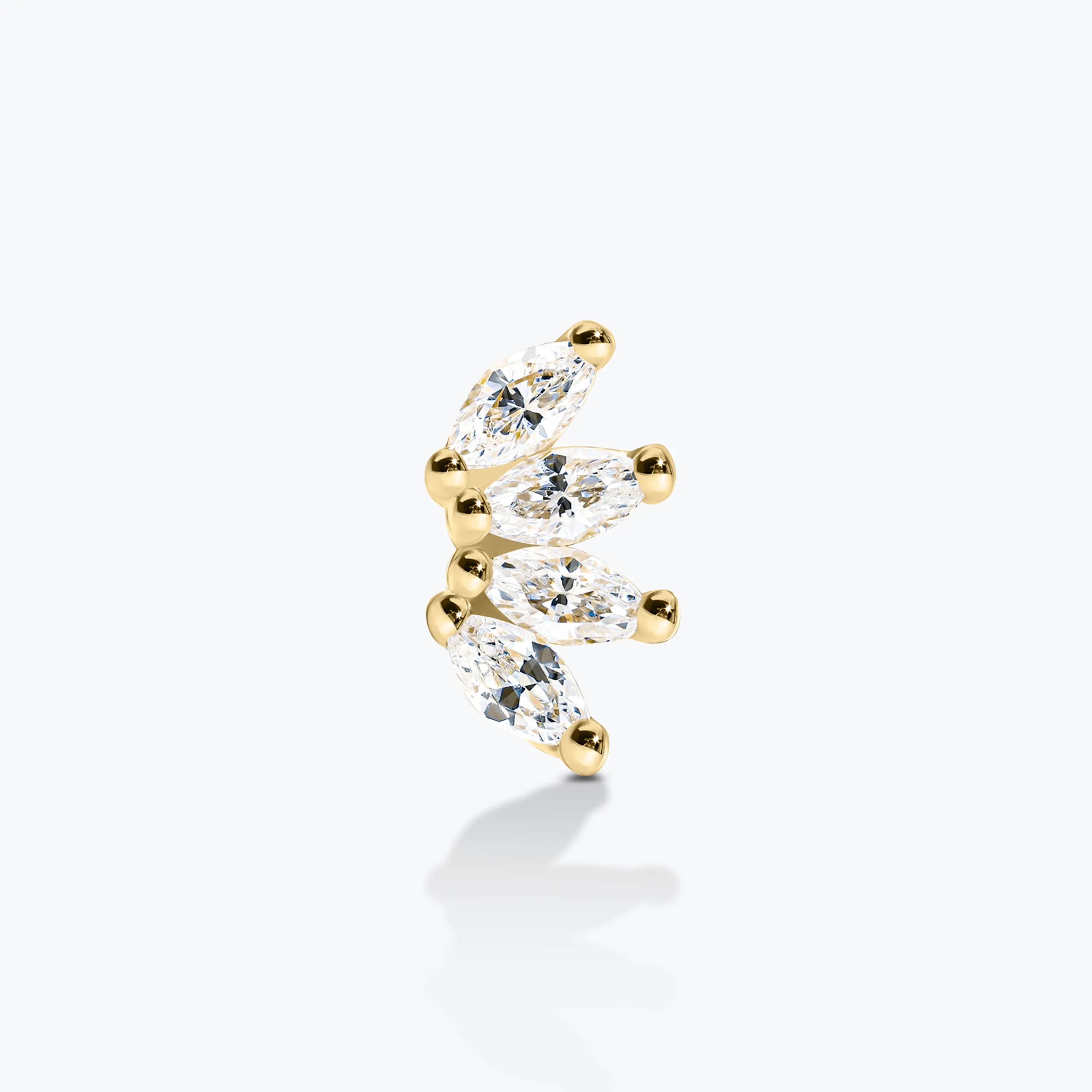עגיל בודד עשוי זהב 14K בעיצוב לוטוס עם ארבעה עלים, בהשראת צורת חצי פרח אלגנטית ועדינה. העגיל משובץ זרקונים בחיתוך מרקיז היוצרים מראה רך ומאוזן, עם נוכחות עדינה אך בולטת. מתאים לענידה כעגיל הליקס, פירסינג או עגיל שני ושלישי, עם סגירת הברגה נוחה ובטוחה לשימוש יומיומי.
