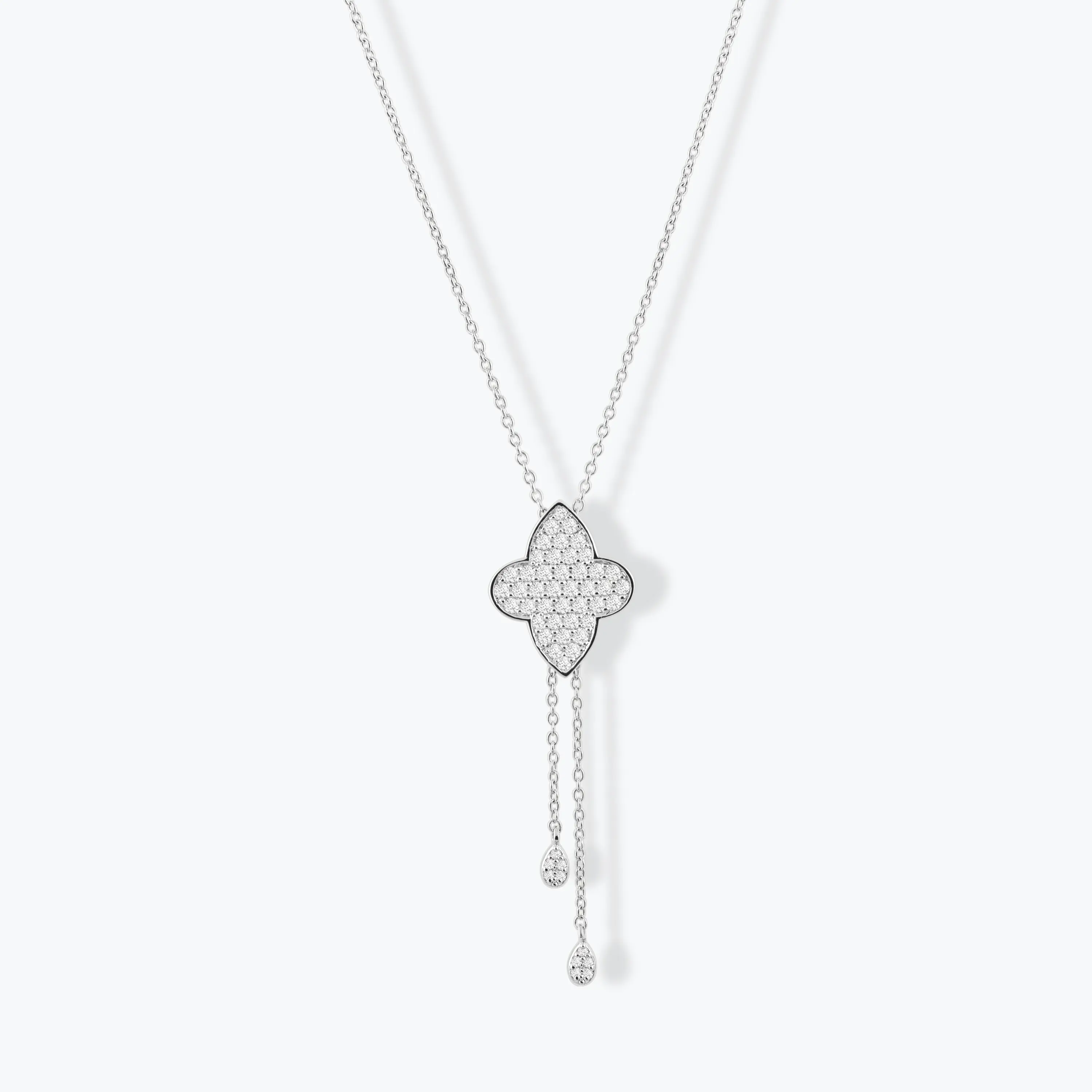 שרשרת זהב לבן 14K במראה עניבה ובשיבוץ 52 יהלומים טבעיים ונוצצים בעיצוב תליון תלתן, המשובץ כולו ביהלומים קטנים צפופים המעניקים לו ברק מרהיב מכל זווית. משני קצותיו משתלשלות שתי שרשראות דקות, שבקצה כל אחת תליון טיפה עדין משובץ יהלומים. שרשרת שמשלבת קלאסיות עם טוויסט מודרני, ומוסיפה מגע של זוהר ותנועה לכל מראה.