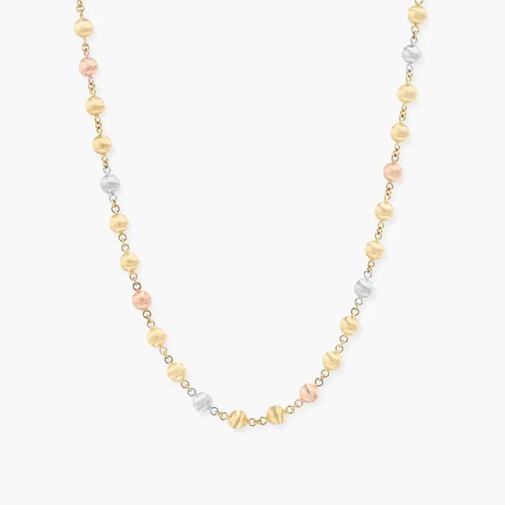 שרשרת זהב 14K הבנויה מכדורי זהב בגימור משי בצבעי זהב צהוב, לבן ואדום. אורך השרשרת 44 ס"מ. קוטר הכדור 5 מ"מ