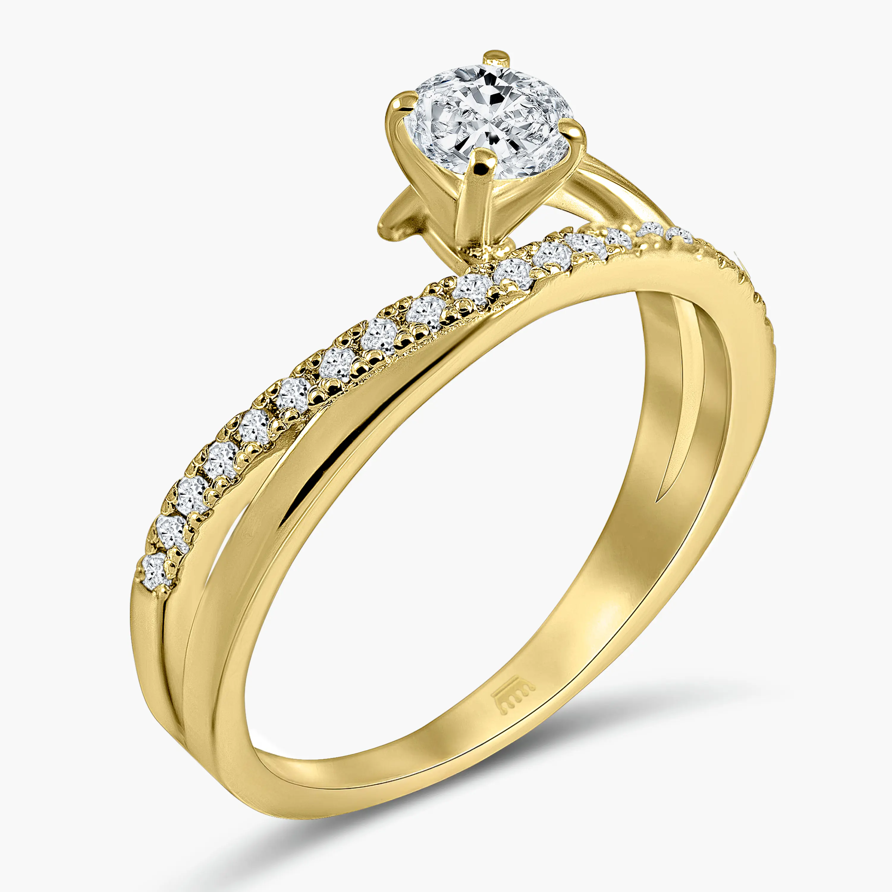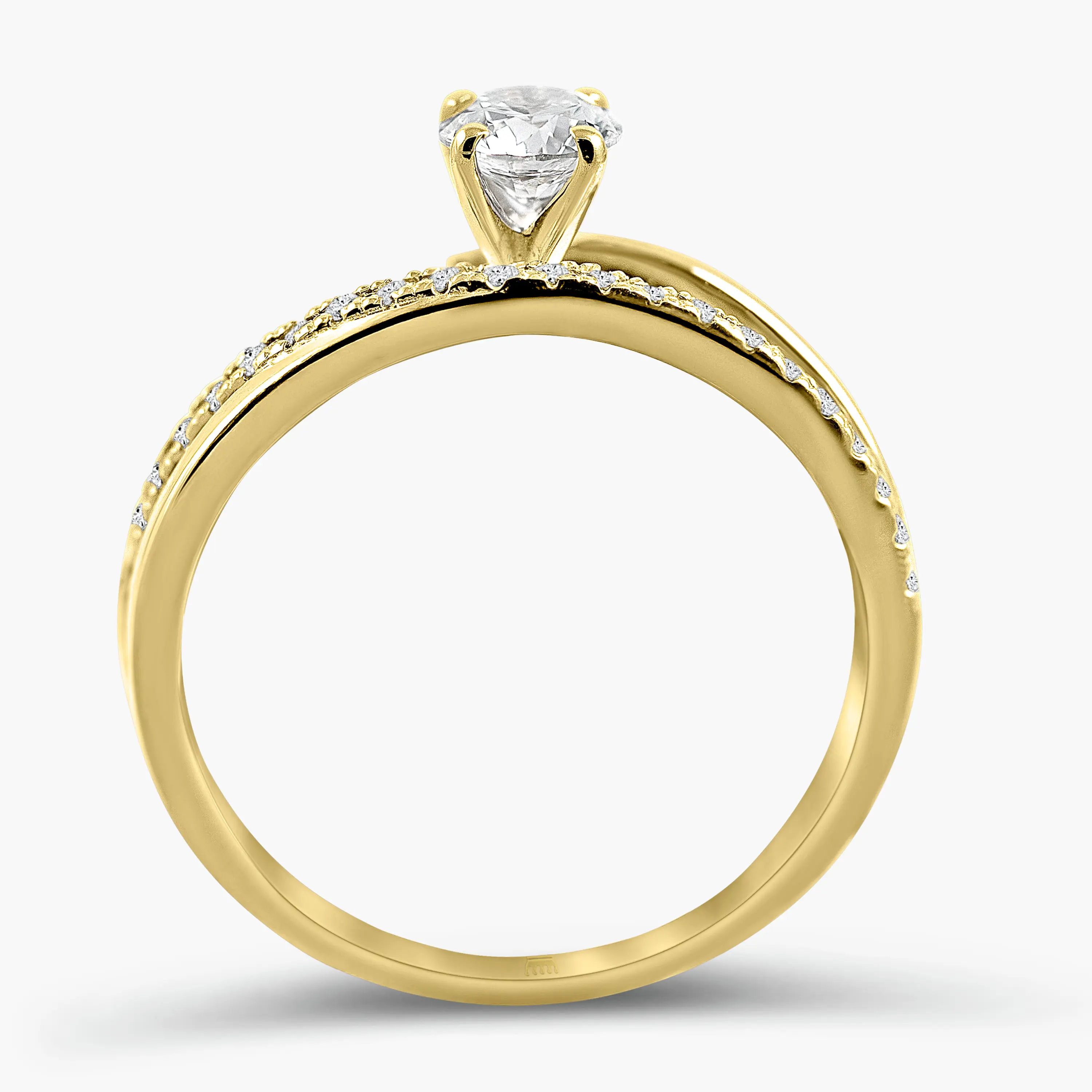 טבעת עשויה זהב 14K בעיצוב קלאסי ומעודן, עם יהלום מרכזי עגול הנתפס בשיבוץ גבוה המדגיש את הנוכחות והברק. גוף הטבעת משובץ שורת יהלומים עדינים לאורך הכתף, ליצירת מראה אלגנטי, מאוזן ועל זמני.
