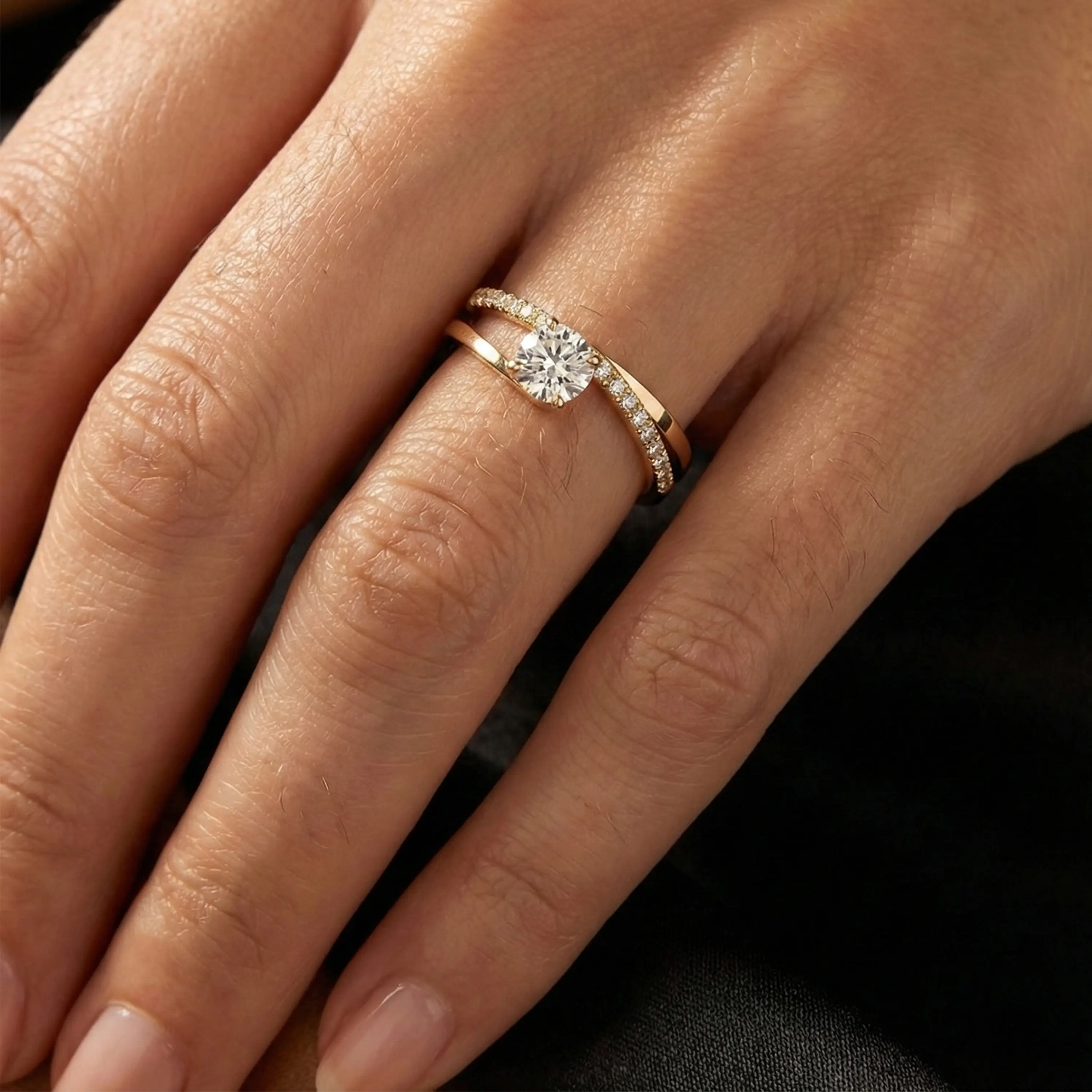 טבעת זהב 14K עם יהלום מרכזי ושיבוץ יהלומים