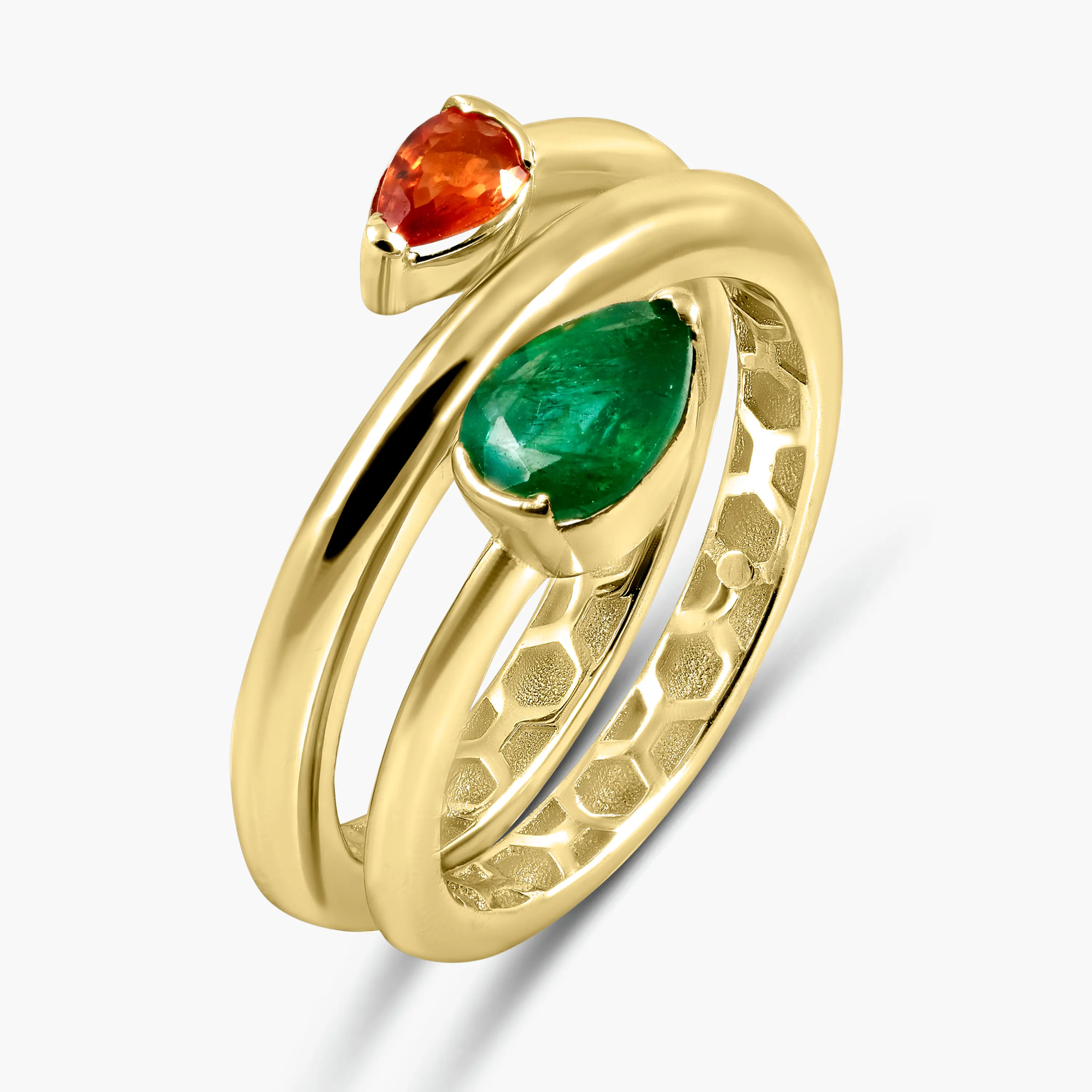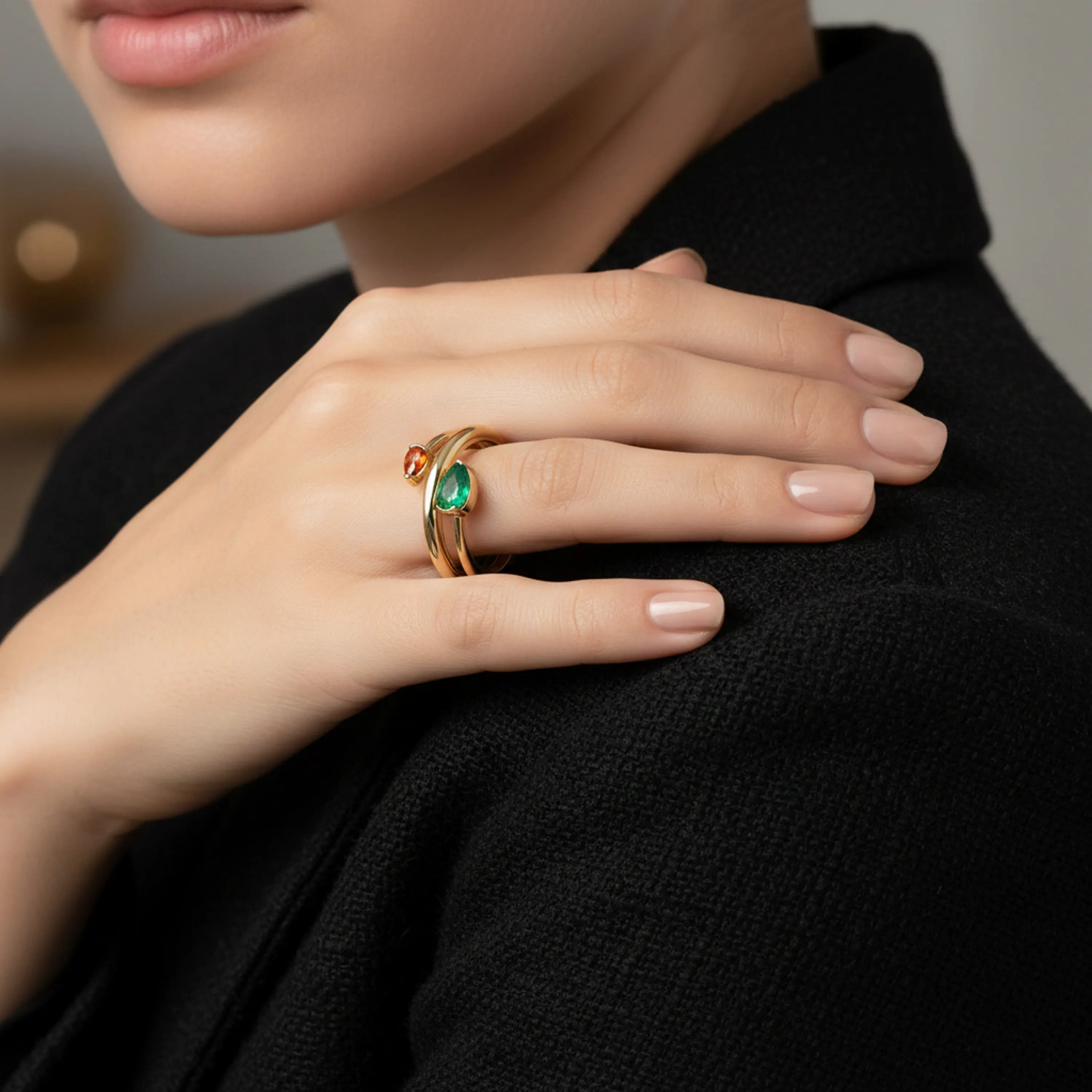 הטבעת משובצת אבן אמרלד מרכזית ואבני ספיר משלימות, היוצרות שילוב צבעים עמוק ויוקרתי עם נוכחות בולטת.