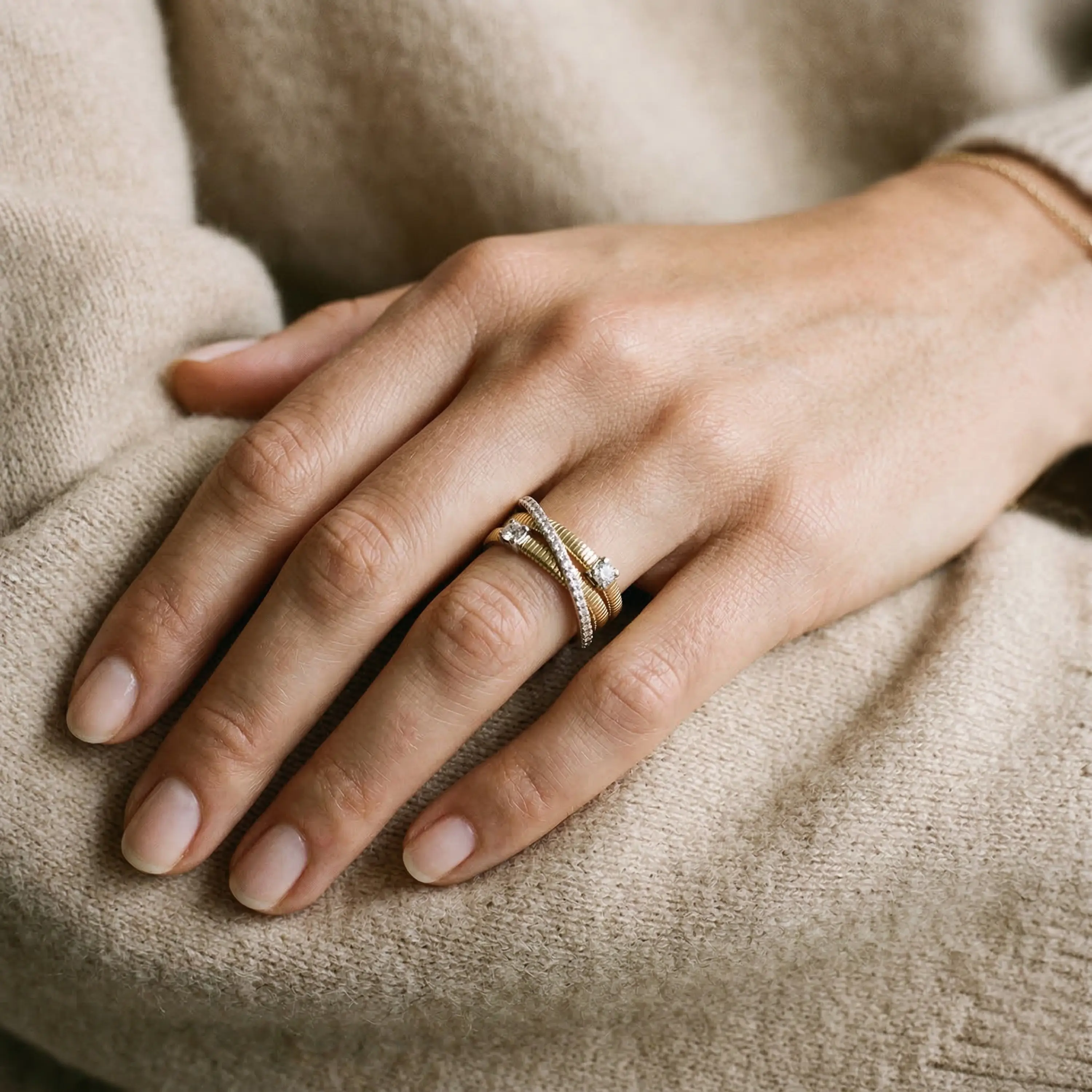 טבעת עשויה זהב 14K בעיצוב דו גוני המשלב זהב צהוב וזהב לבן. מבנה הטבעת כולל אלמנטים מתפתלים במרקם עדין היוצרים עומק ותנועה בעיצוב. בחזית משובצים יהלומים המעניקים ברק מתוחכם, לצד יהלום מרכזי המשובץ בראש הטבעת ומדגיש את המראה האלגנטי. שילוב הצבעים והקווים המעוגלים יוצר טבעת ייחודית עם נוכחות מודרנית ויוקרתית.