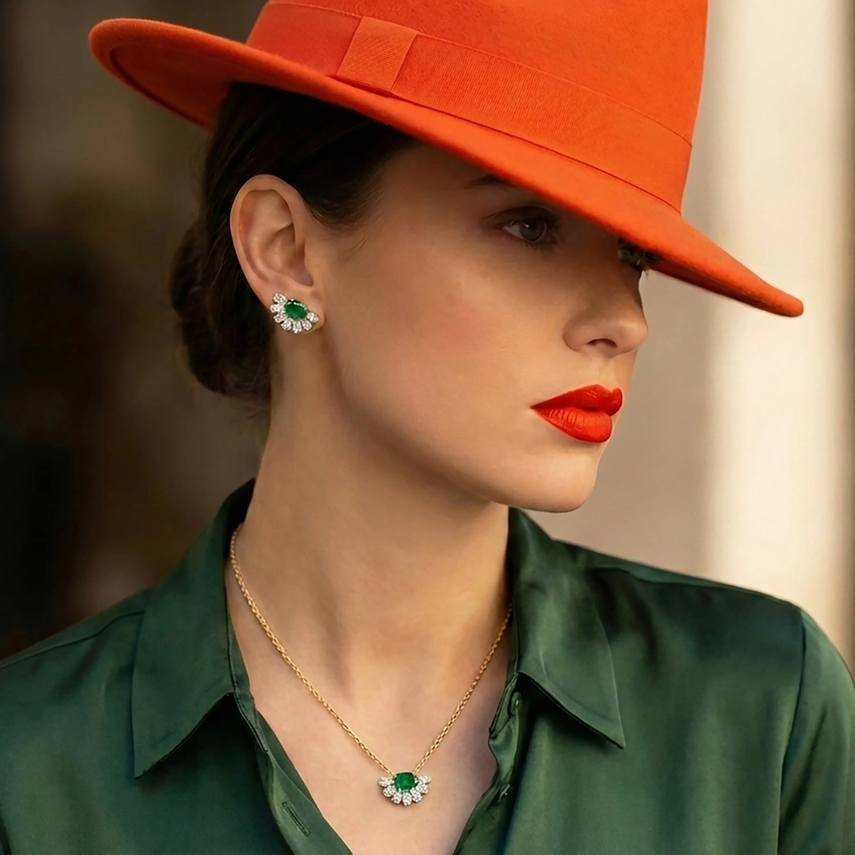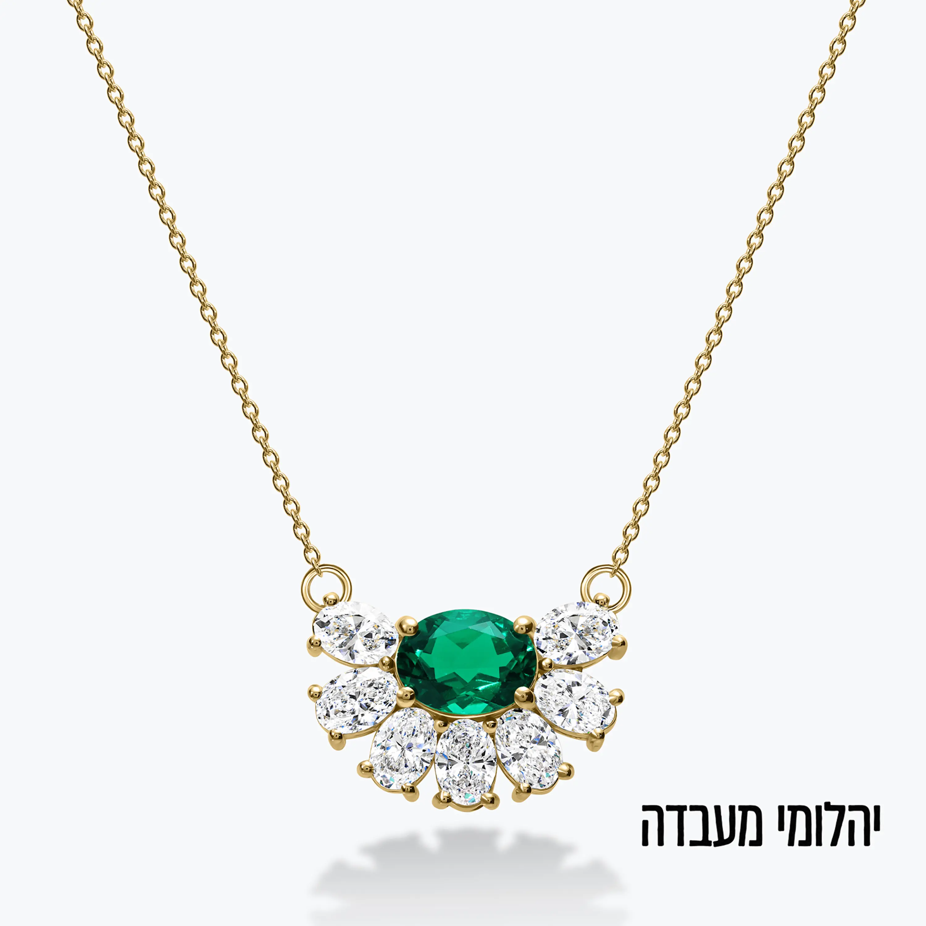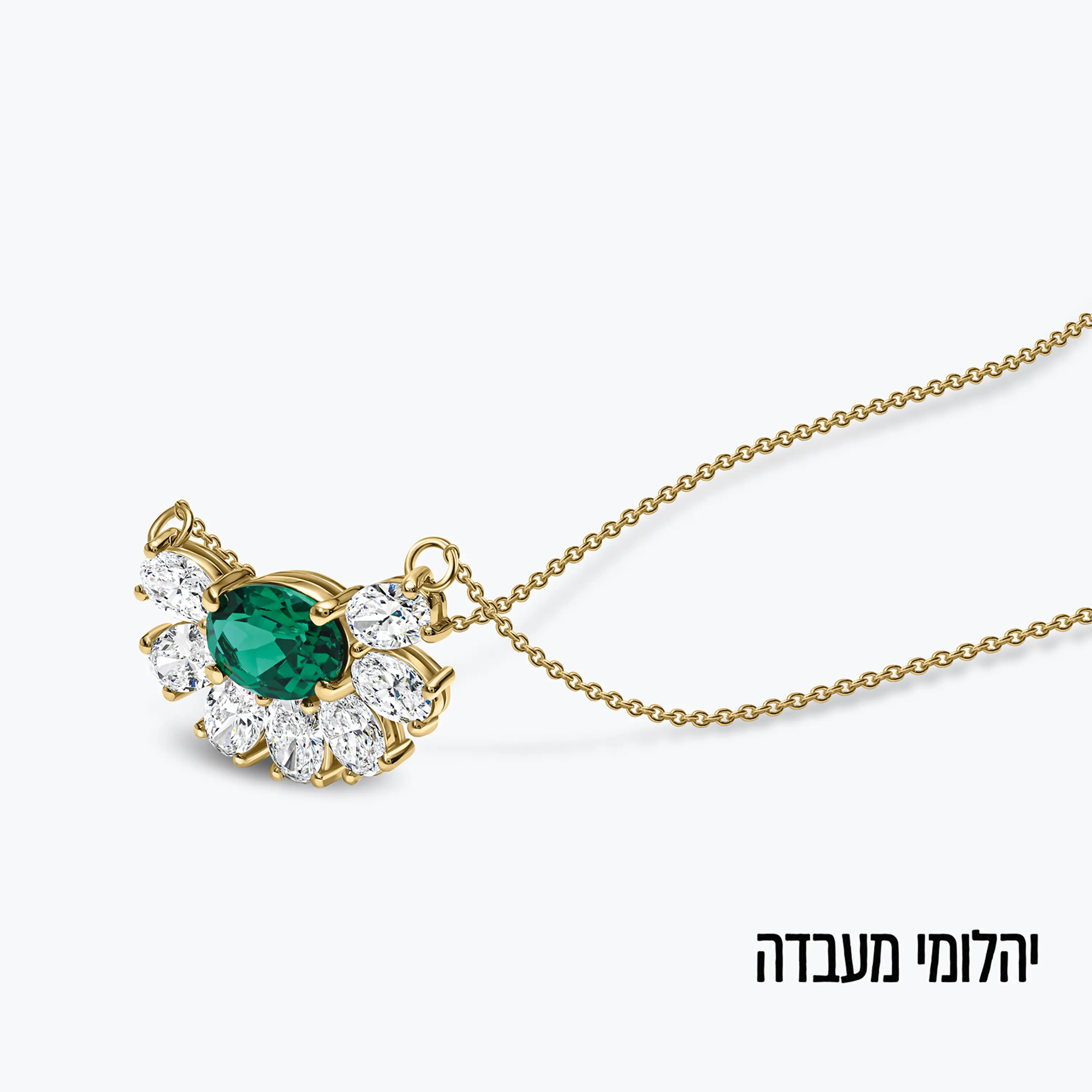 תליון עשוי זהב 14K בעיצוב אלגנטי ומרשים. במרכזו משובץ אמרלד עגול בעל צבע ירוק עמוק, וסביבו מסודרת הילה של יהלומי מעבדה בחיתוך מרקיז המדגישה את האבן המרכזית ומוסיפה ברק וניצוץ מכל זווית. שילוב הקווים הרכים עם שיבוץ האבנים יוצר תכשיט בעל נוכחות יוקרתית ונשית המתאים לענידה יומיומית וגם לאירועים מיוחדים.