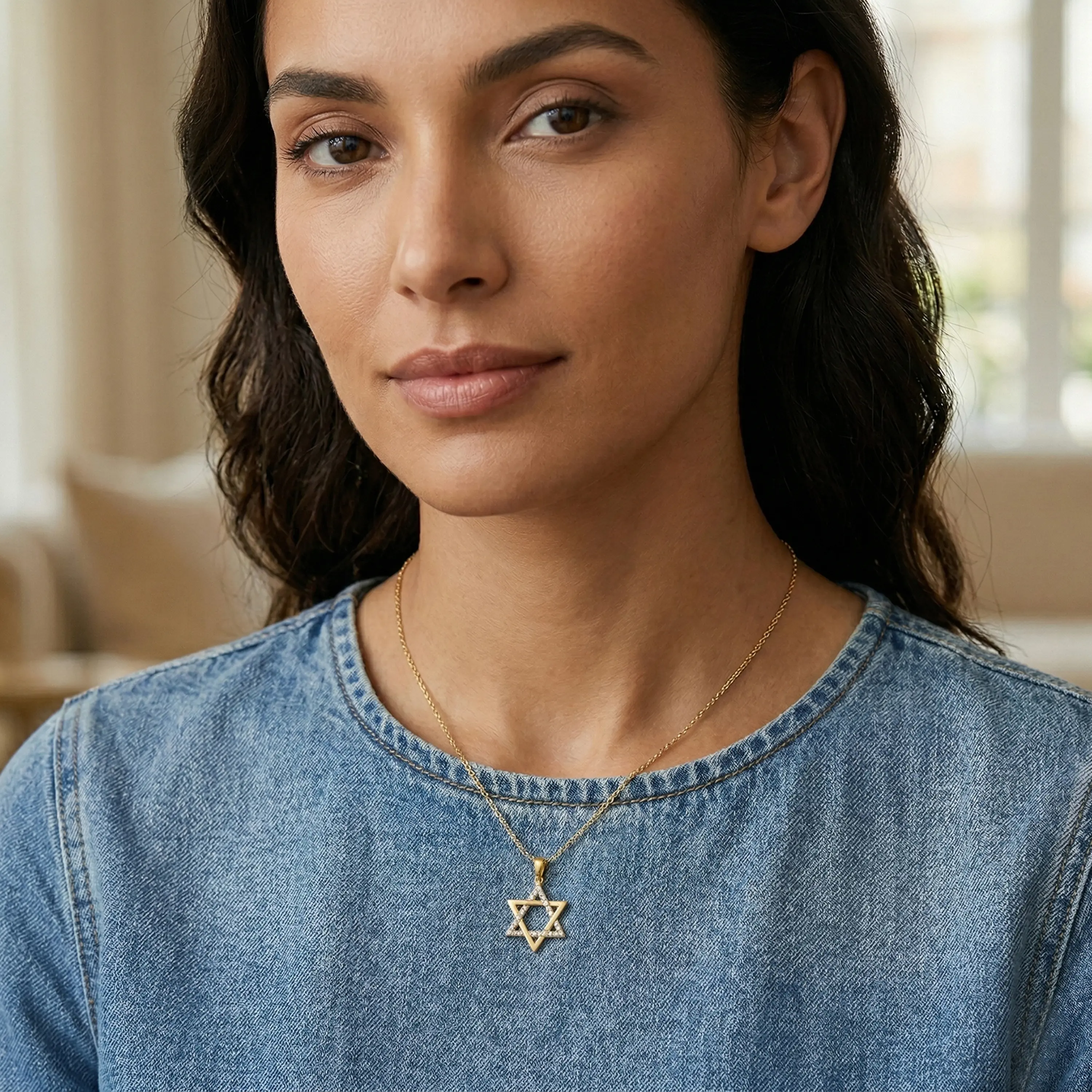 תליון מגן דוד מזהב 14K בעיצוב מודרני המשלב קווים חלקים לצד חלק המשובץ זרקונים המעניקים לתכשיט ברק עדין ומדגישים את צורת הסמל. השילוב בין הזהב החלק לשיבוץ הזרקונים יוצר משחק אור עדין ומוסיף נגיעה אלגנטית לעיצוב הקלאסי. מידות התליון 2.5 ס"מ על 1.5 ס"מ כולל לולאה, המעניקות לו נוכחות בולטת אך מאוזנת על הצוואר. התוצאה היא תכשיט בעל מראה על זמני המשתלב בקלות עם שרשרת עדינה ומתאים לענידה יומיומית או להשלמת הופעה אלגנטית.