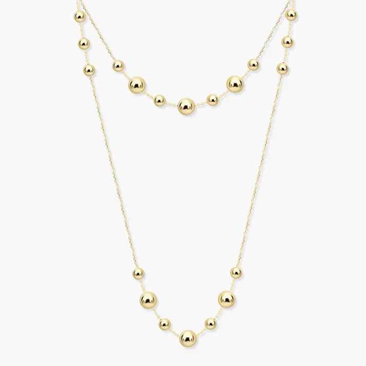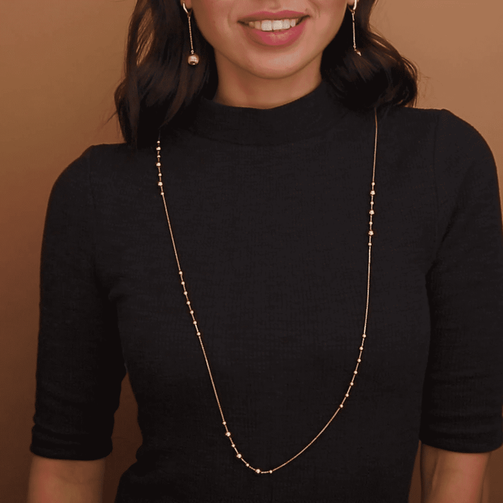 שרשרת זהב 14K ארוכה באורך מטר הנענדת כשתי שרשראות אחת מעל השניה או כשרשרת אחת ארוכה. לאורך השרשרת כדוריות זהב בגימור מבריק.