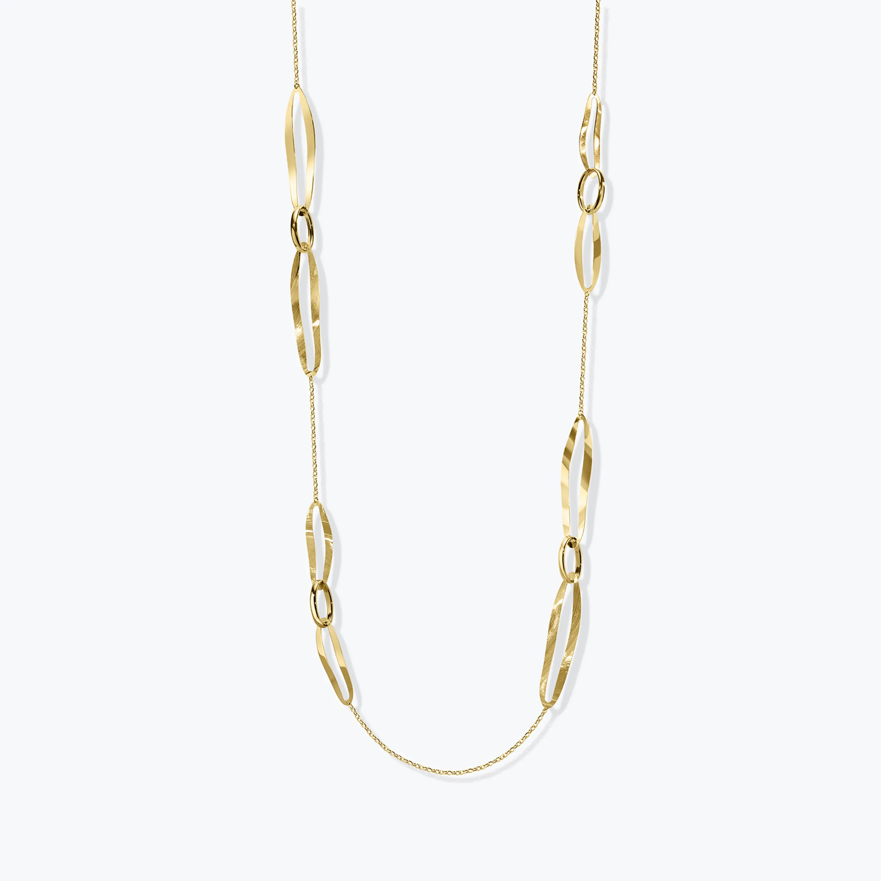 שרשרת זהב 14K באורך 80 ס"מ בעיצוב ייחודי המשלב חוליות אובליות במידות משתנות היוצרות מראה דינמי ומעניין. לאורך השרשרת משולבות חוליות גדולות במידות כ 4.5 על 1.2 ס"מ, חוליות בינוניות במידות כ 3 על 1 ס"מ וחוליות קטנות במידות כ 1.5 על 1 ס"מ, המחוברות ביניהן במבנה מאוזן המדגיש תנועה וזרימה. השילוב בין החוליות המלוטשות לשרשרת העדינה יוצר ניגוד מדויק בין נוכחות לאלגנטיות, ומתאים לענידה כפריט מרכזי או בשילוב שכבות ליצירת מראה עשיר ומתוחכם.