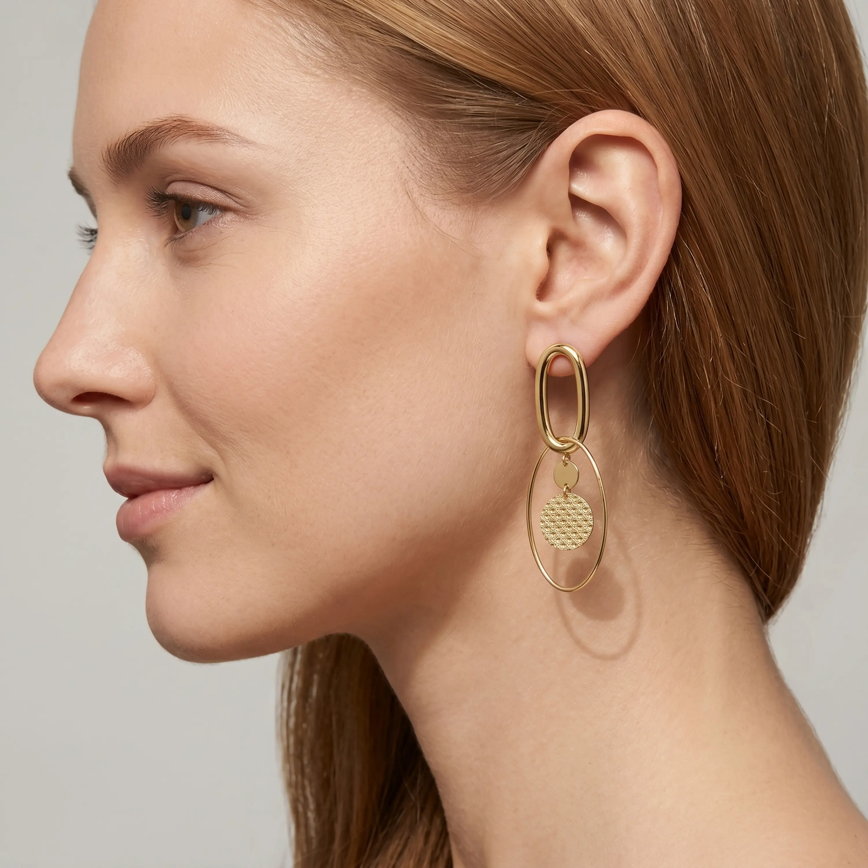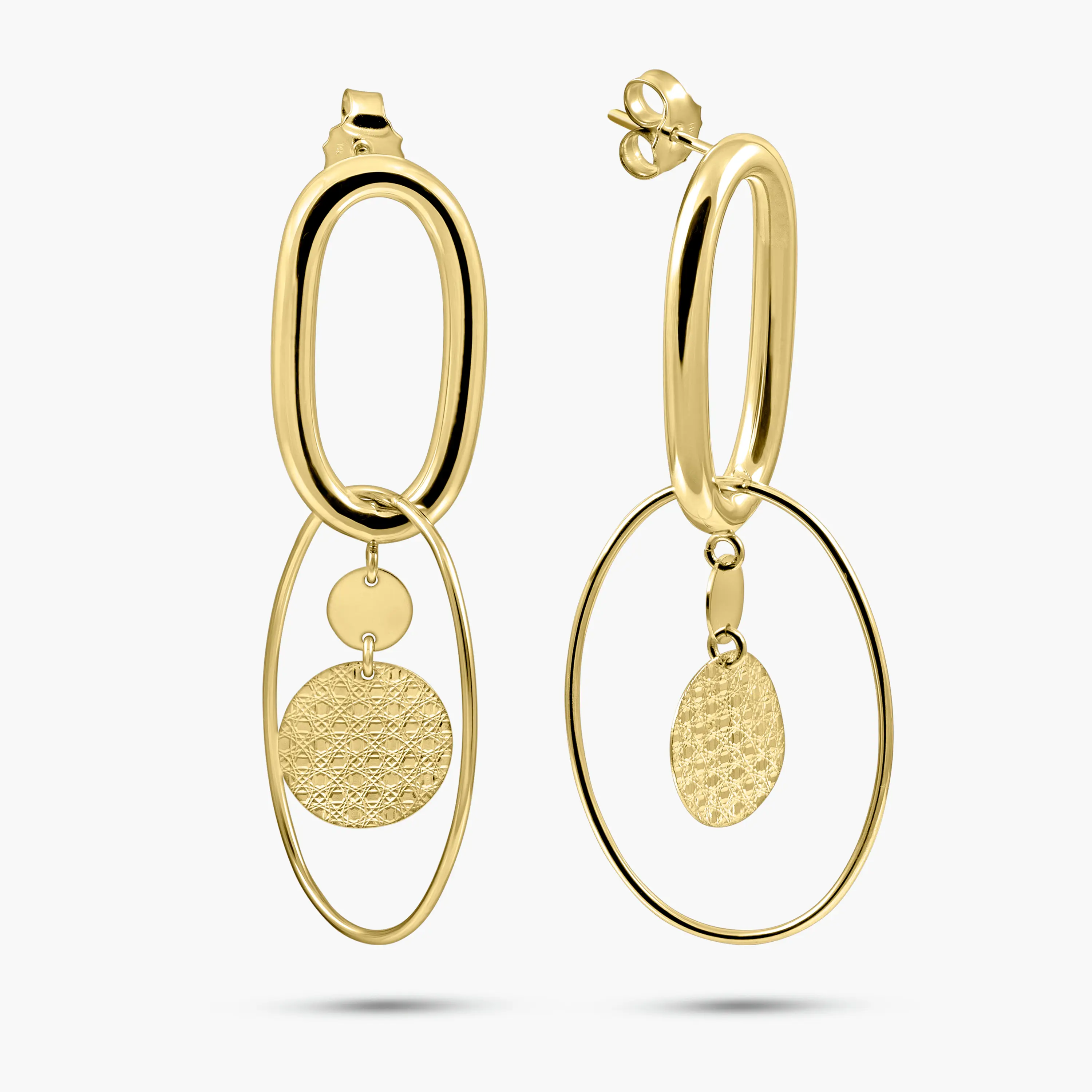 עגילים מזהב 14K באורך של כ 5.3 ס"מ, בעיצוב מודרני המשלב שתי אליפסות במידות שונות היוצרות מבנה מדורג ומעניין. האליפסה העליונה במידה כ 2.6 על 1.3 ס"מ מתחברת לאליפסה גדולה יותר במידה כ 3 על 2.2 ס"מ, ובתוכן משתלבים אלמנטים תלויים המוסיפים תנועה ועדינות. אחד האלמנטים כולל דיסקית בעלת טקסטורה חרוטה היוצרת משחק אור עדין, לצד דיסקית חלקה המאזנת את המראה. השילוב בין קווים נקיים לתנועה חופשית מעניק לעגילים נוכחות אלגנטית עם טוויסט עיצובי שמתאים גם ליום וגם לערב.