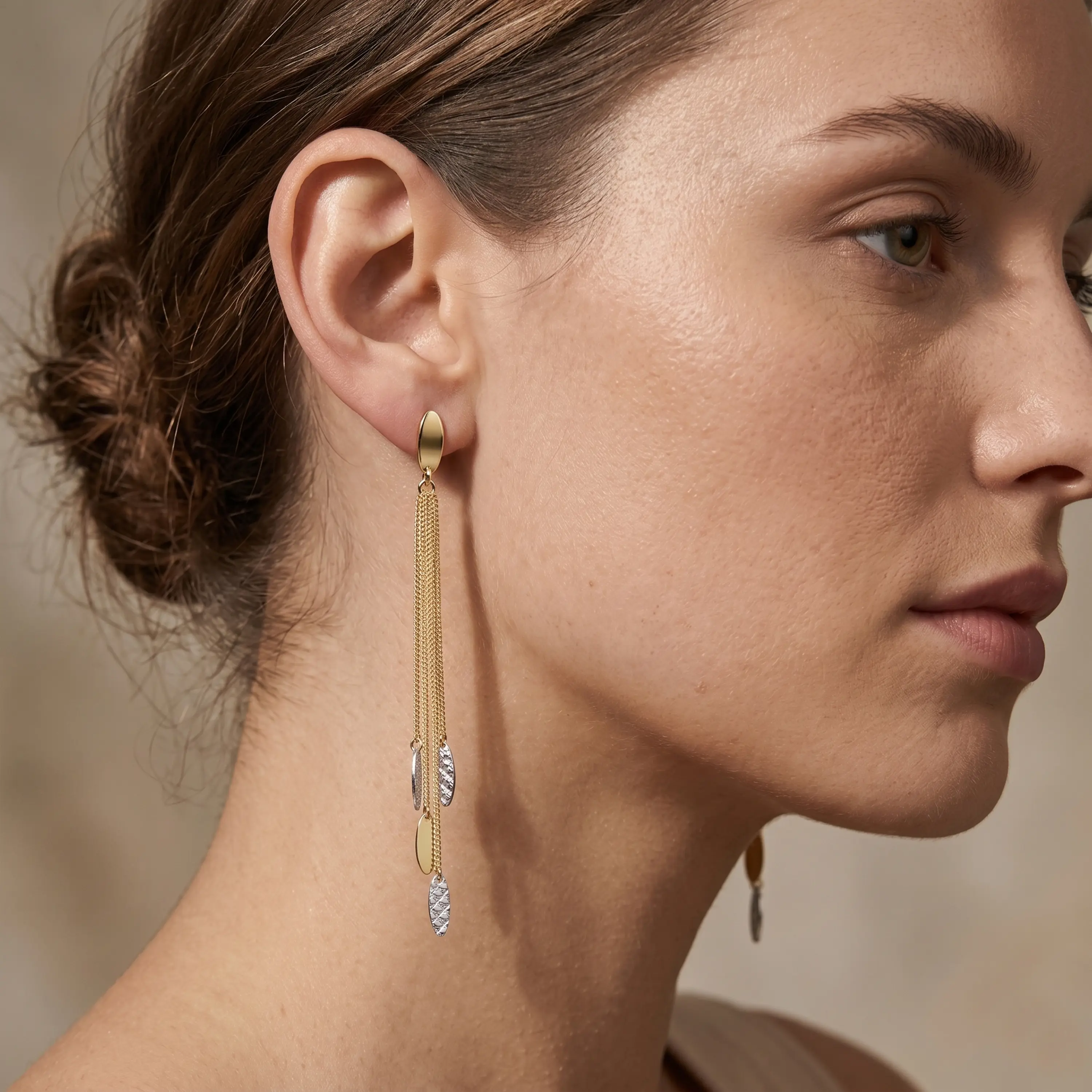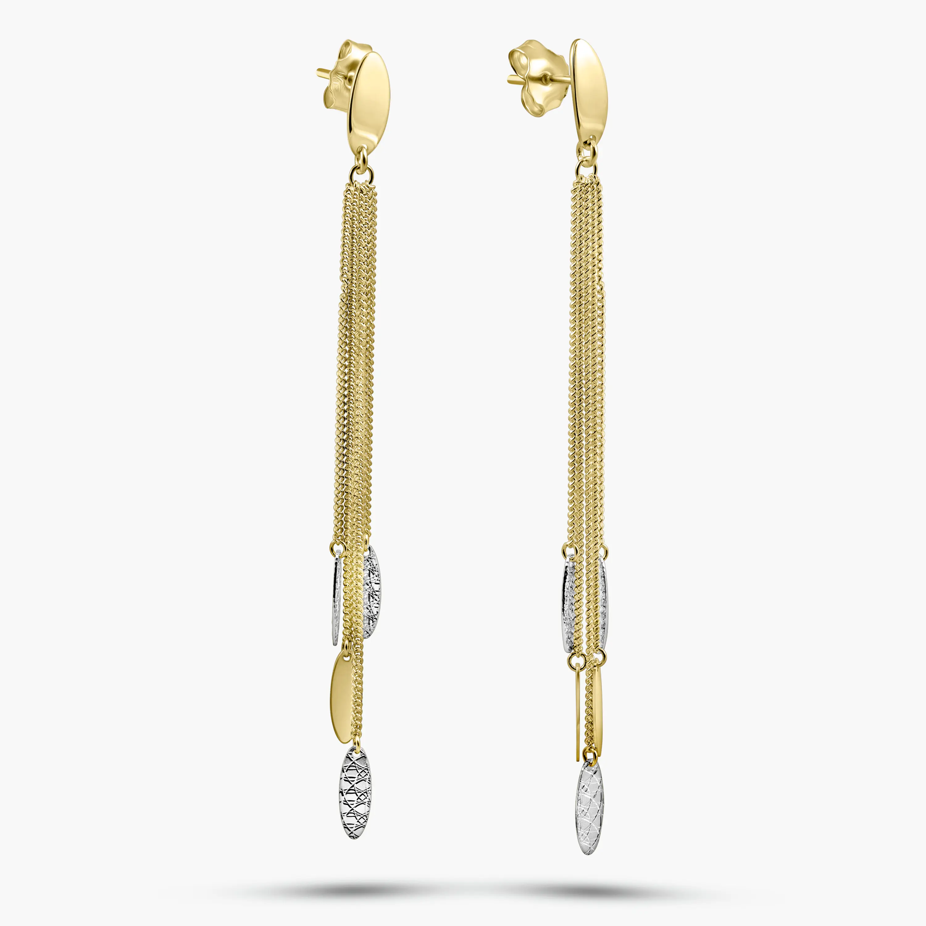 עגילים מזהב 14K בעיצוב ארוך ודינמי באורך משתנה הנע בין כ 6 ס"מ לכ 8 ס"מ, המעניק מראה זורם ותנועתי. העגילים מורכבים מחמישה אלמנטים שונים המשתלבים לאורך שרשראות דקות, כאשר חלקם בגימור חלק וחלקם בעלי דוגמה עדינה היוצרת משחק אור מעניין. השילוב בין האלמנטים המדורגים לבין התנועה החופשית של השרשראות יוצר נוכחות אלגנטית עם אופי ייחודי, המתאים למראה ערב מוקפד או ללוק יומי עם אמירה עיצובית.