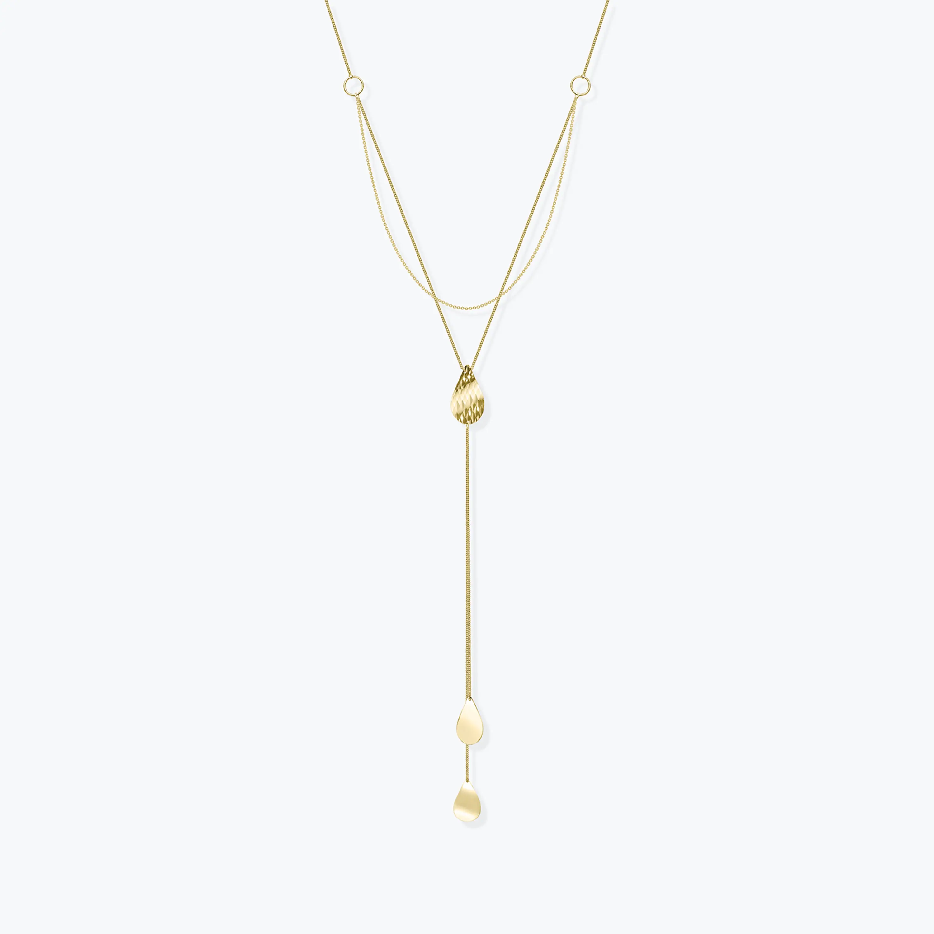 שרשרת זהב 14K בעיצוב כפול המשלבת שתי שכבות באורכים 40 ו 42 ס"מ עם הארכה של 3 ס"מ ליצירת מראה מדורג ועדין. במרכז משתלב אלמנט טיפה בעל טקסטורה עדינה שממנו נמשכת שרשרת תלויה המסתיימת בשתי טיפות נוספות, היוצרות תנועה זורמת ונוכחות אלגנטית. מידות הטיפות 2.3 על 1.3 ס"מ ו 2 על 1 ס"מ ומדגישות את הקו המאורך של התכשיט. התוצאה היא שרשרת נשית ומודרנית המתאימה לענידה יומיומית וגם להשלמת הופעה מוקפדת עם טאץ' ייחודי.