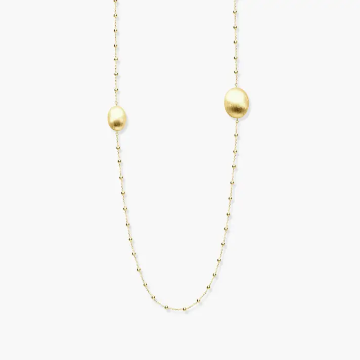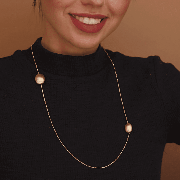 שרשרת זהב 14K באורך 70 ס"מ המעוטרת בכדוריות זהב ובשני חלוקי נחל עשויים זהב בגימור מט מוברש בגודל 1.5X1 ס"מ ובאורך 0.8-1 ס"מ.