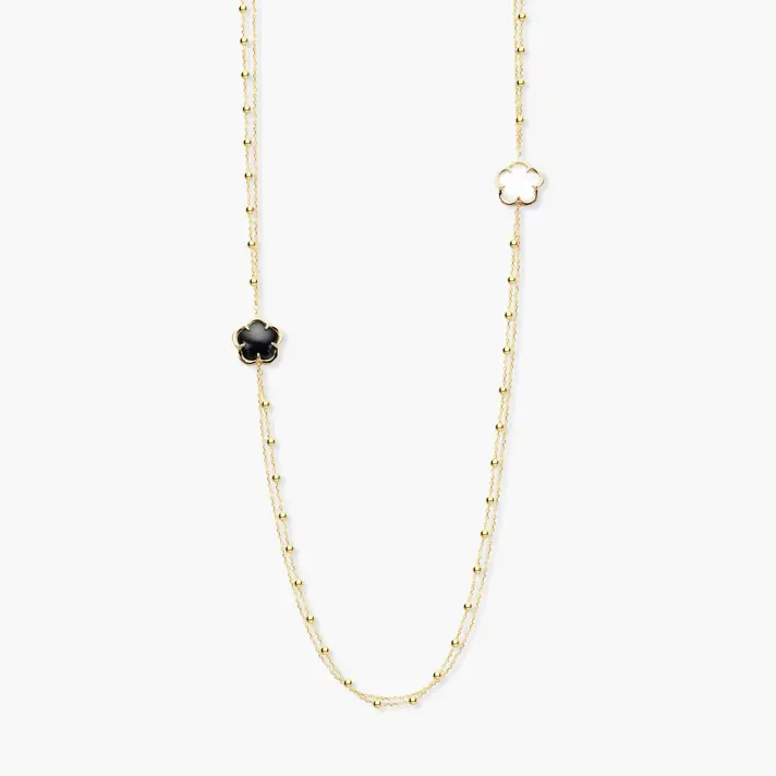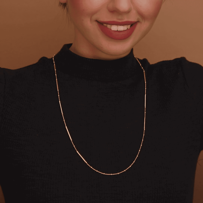 שרשרת זהב 14K ארוכה באורך 70 ס"מ הבנויה מכדוריות זהב וגלילי זהב בגימור ספירלי.