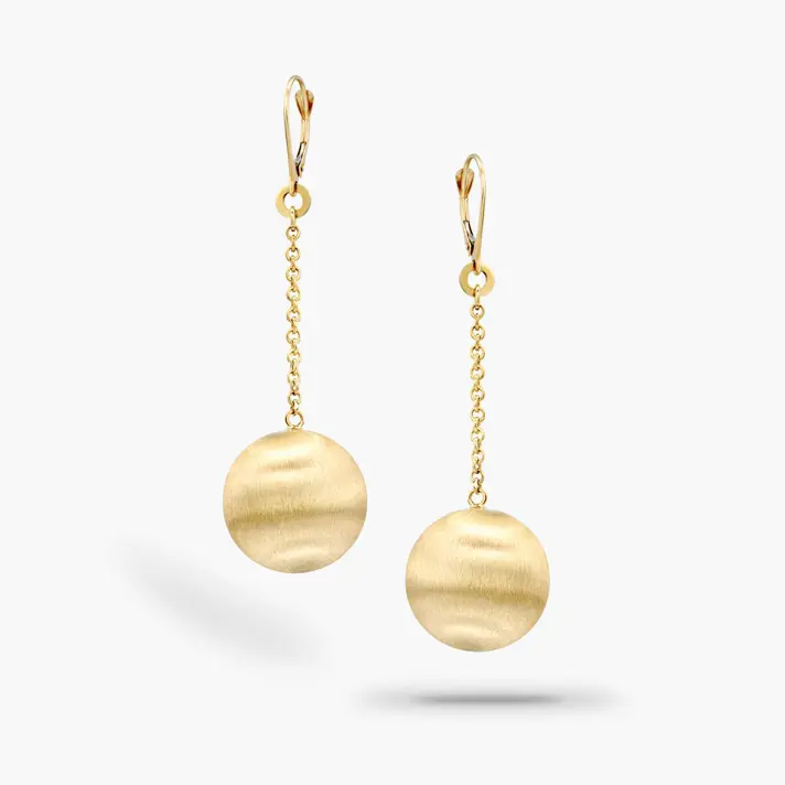 עגילי זהב 14K תלויים באורך 6.0 ס"מ ובסופם עיגולי זהב מוברש. קוטר הכדור 2 ס"מ