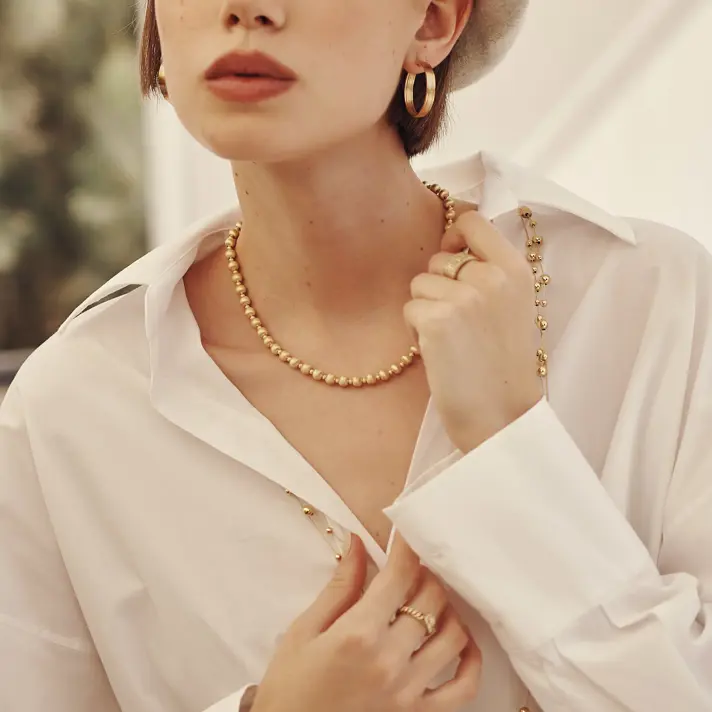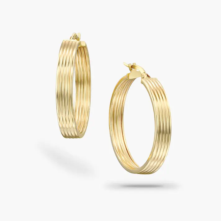 עגילי זהב 14K בצורת חישוק המעוצב ככמה חישוקים צמודים זה לזה. קוטר העגילים 2.6 ס"מ. רוחב העגיל 0.45 ס"מ