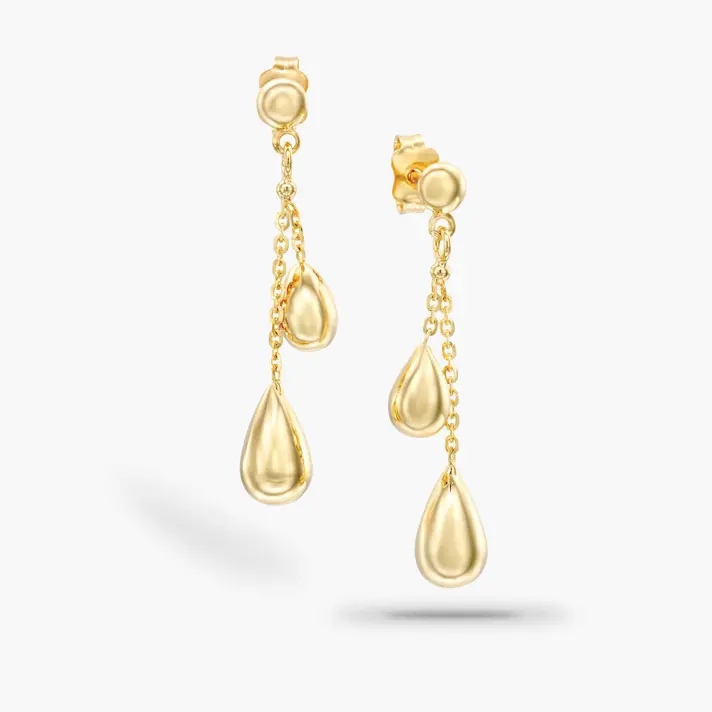 עגילי זהב 14K תלויים . בכל עגיל 2 טיפות זהב מבריק. אורך העגילים 3 ס"מ.