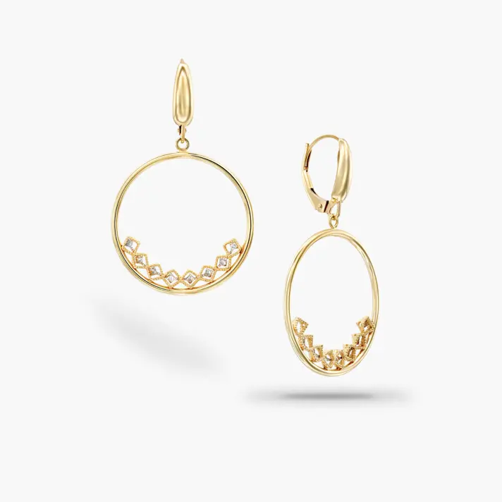עגילי זהב 14K בצורת חישוקים תלוים המשובצים בצידם הפנימי בזירקונים נוצצים. אורך העגילים 4 ס"מ וקוטרם 2.4 ס"מ.