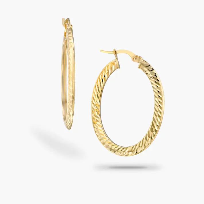 עגילי זהב 14K גובה 3 ס"מ בגימור לייזר היוצר נצנוץ משבירת אור השמש בעגילים. רוחב העגיל 2.3 ס"מ