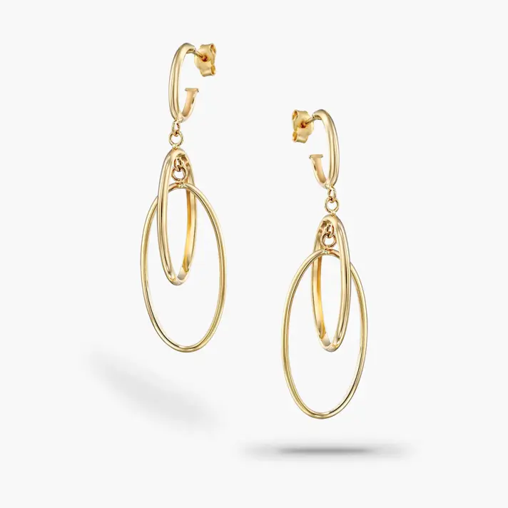 עגילי זהב 14K תלויים המורכבים משני חישוקים התלויים זה בתוך זה. אורך העגילים 5 ס"מ.