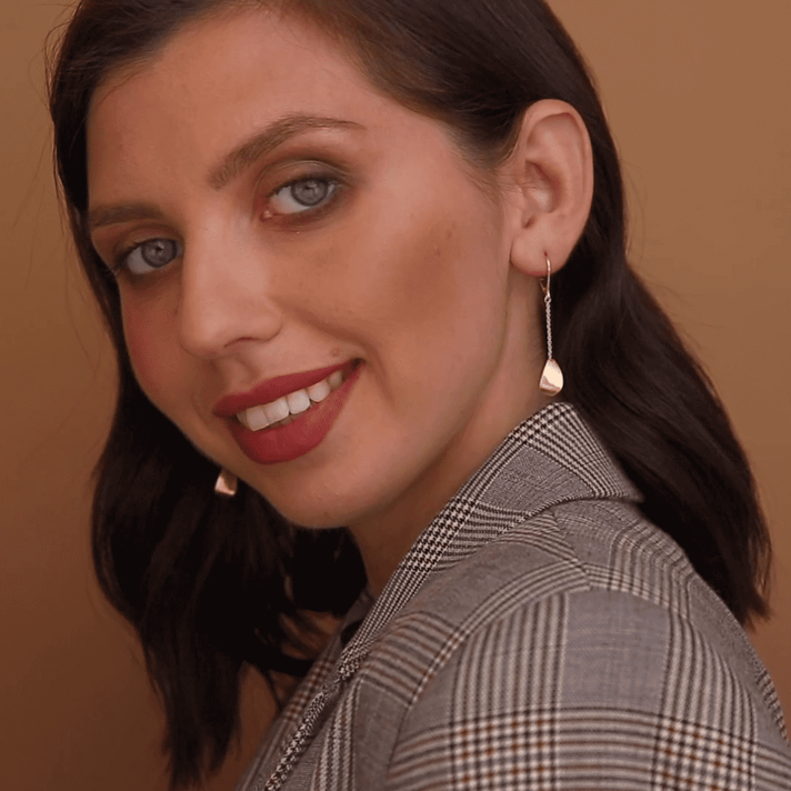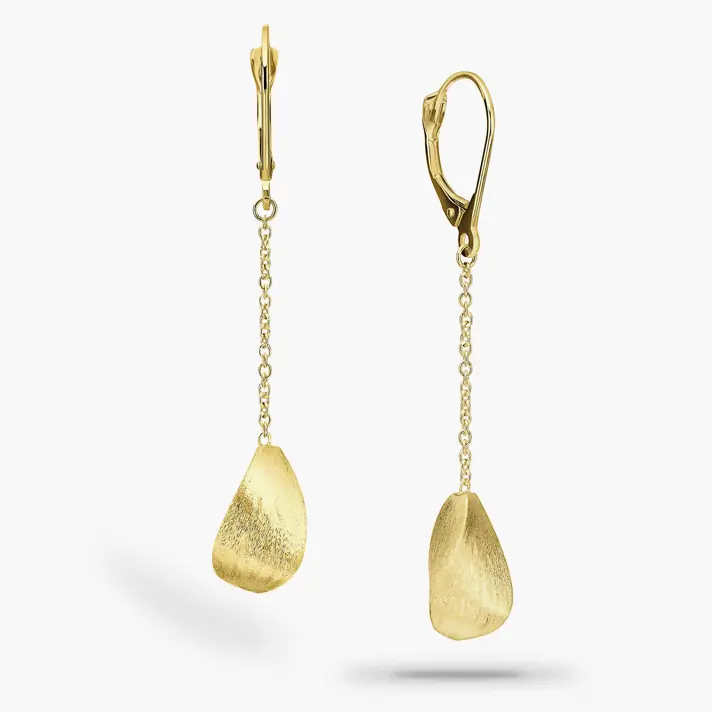 עגילי זהב ארוכים באורך 4.8 ס"מ עם חלוקי נחל מוזהבים בגימור מט ובגודל 1.3*1 ס"מ.