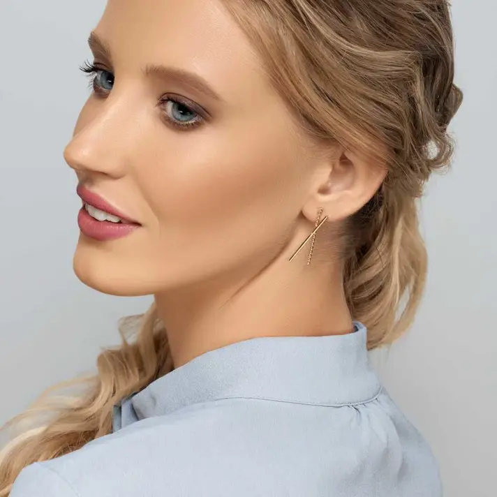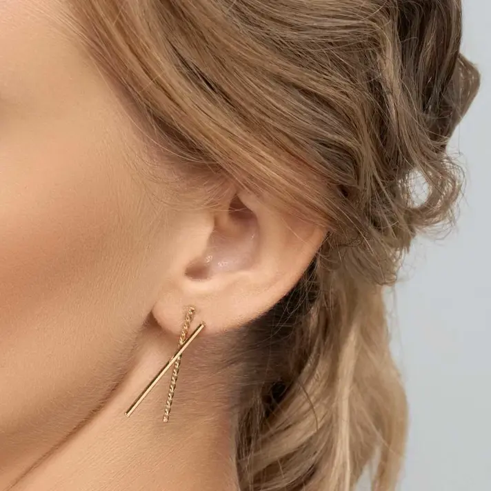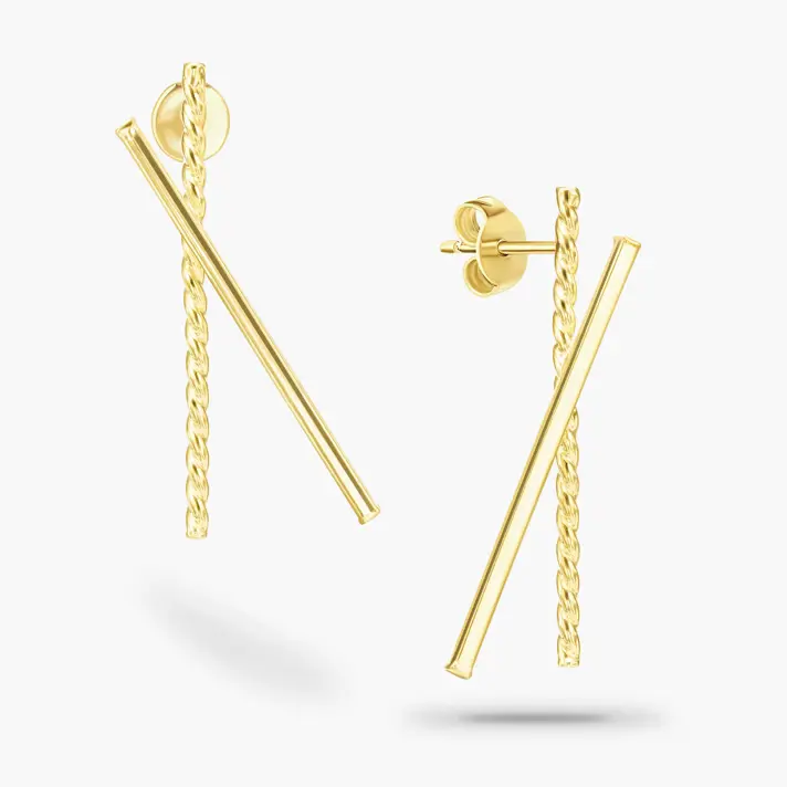 עגילי זהב 14K בצורת X עם צד אחד בטקסטורה ספירלית . אורך העגילים 3 ס"מ.