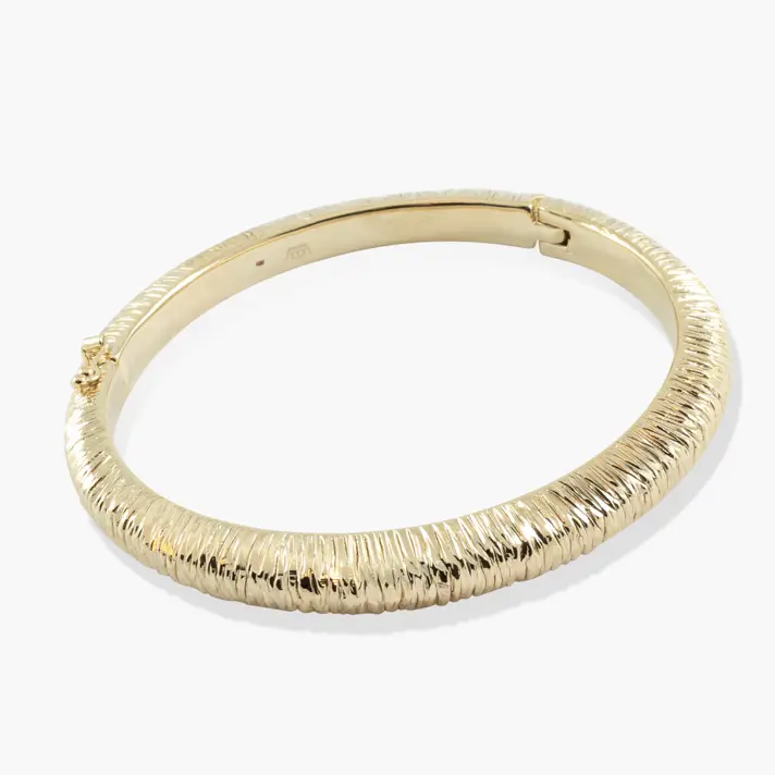 צמיד זהב 14K בגימור לא חלק. קוטר 6.2 ס"מ, עובי - 0.8 ס"מ, גובה - 0.6 ס"מ