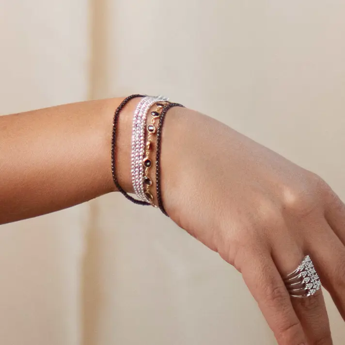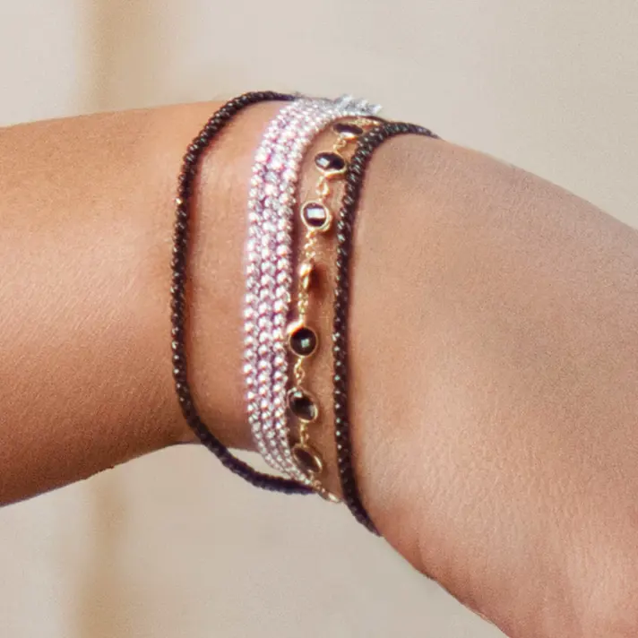 צמיד זהב 14K שחור הבנוי מכדוריות זהב בגימור לייזר מנצנץ. אורך הצמיד 18.5 ס"מ.