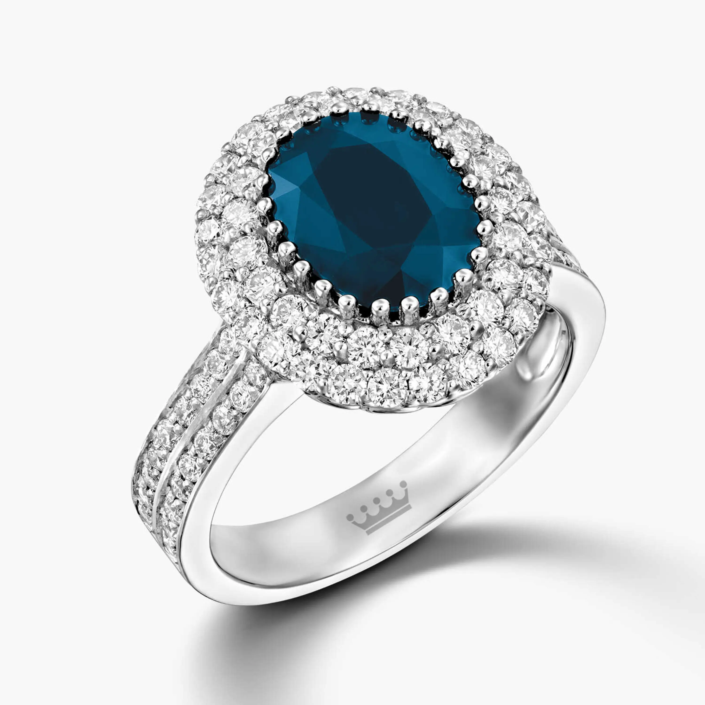 טבעת זהב לבן 14K משובצת באבן ספיר במשקל של מעל 2 קראט וסביבה 82 יהלומים נוצצים ברמת נקיון SI ובצבע H.אורך ראש הטבעת 1.4 ס"מ. רוחב ראש הטבעת 1.2 ס"מ. אורך ספיר 0.8 ס"מ, רוחב ספיר 0.6 ס"מ