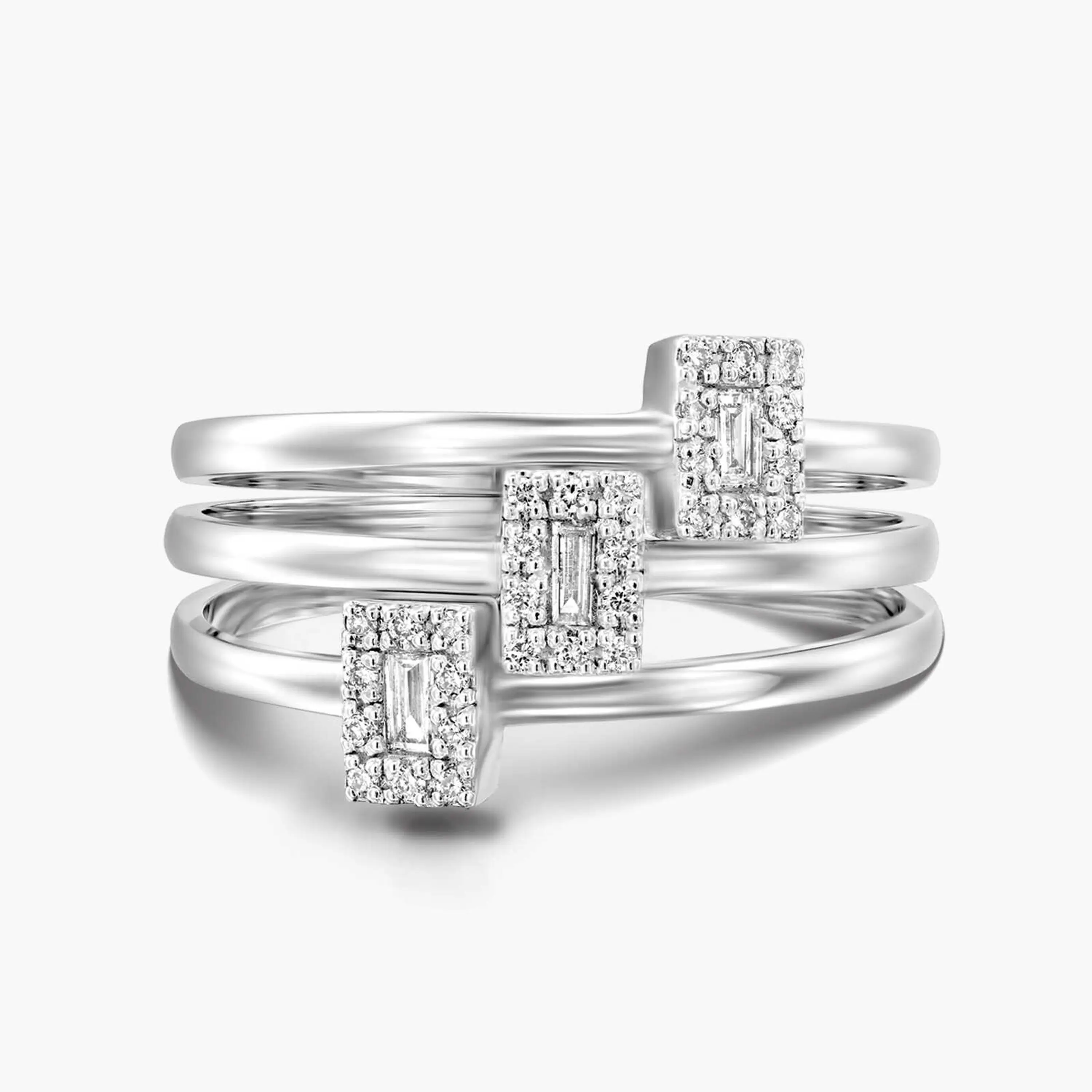 סט 3 טבעות זהב 14K המשובצות יחד ב 30 יהלומים עגולים ועוד 3 יהלומי באגט יוקרתיים. ניתן לענוד את הטבעות יחד או בנפרד. עובי הטבעת 0.6 ס"מ