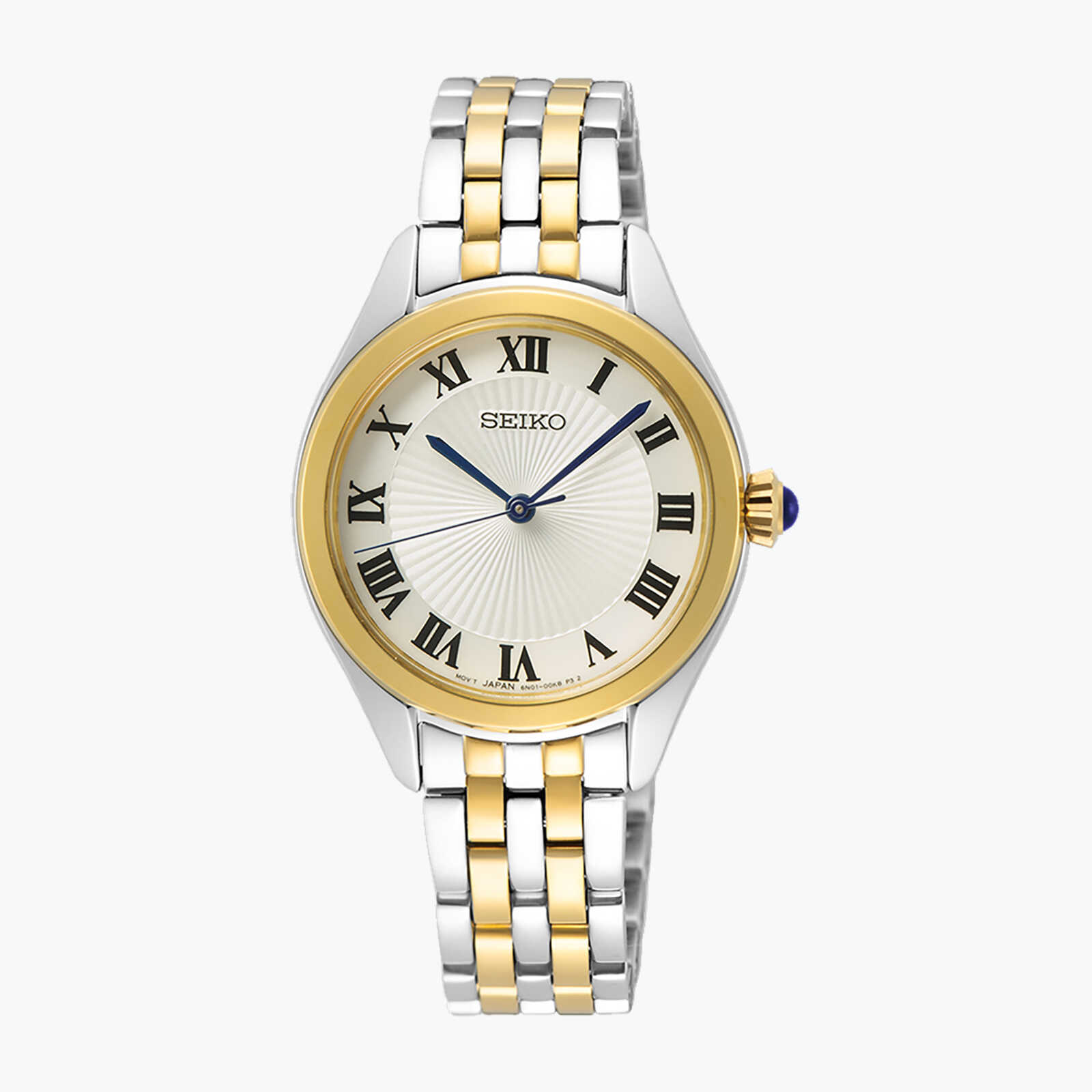 שעון SEIKO אלגנטי לנשים בעל לוח עם טקסטורת קרני שמש , ספרות רומיות ומחוגים כחולים. לשעון צמיד מתכת איכותי בגווני זהב לבן וצהוב וכתר עם אבן חן כחולה. לשעון זכוכית HARDLEX למניעת שריטות והוא עמיד במים ל 50 מטר עומק. קוטר השעון 29 מ"מ ומשקלו 55 גרם בלבד.